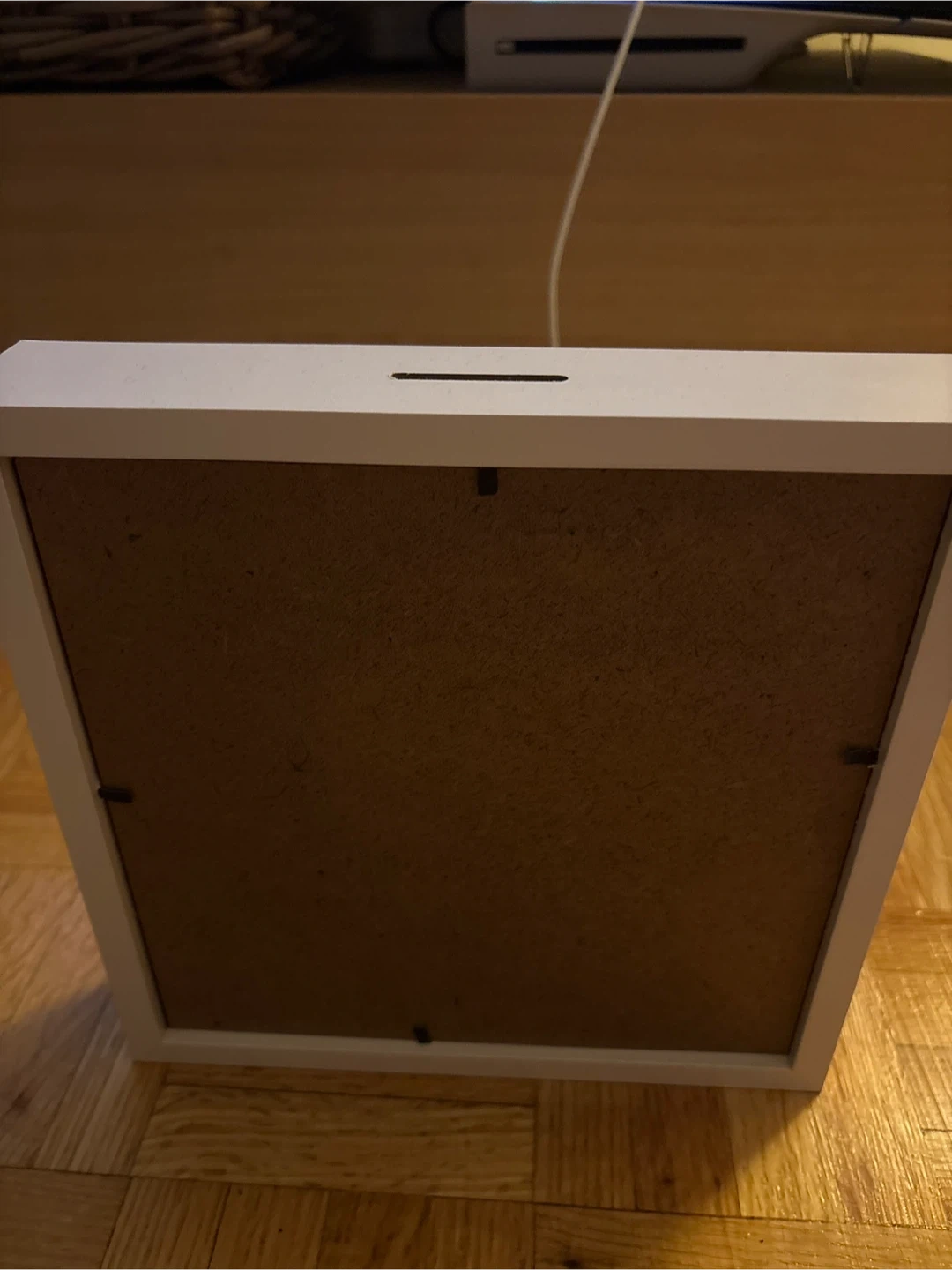 This white shadow box is designed as a coin bank for your travel fund. It features a slot on top for inserting coins and bills. The front displays a graphic with the words 'Travel Fund' and travel-themed imagery.
