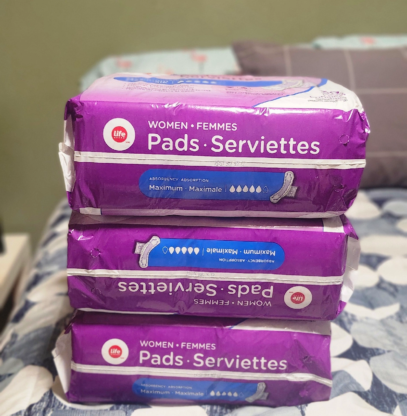 Free to new home or tease. 3 packs of Life Brand women's pads. These are designed for maximum absorbency. Each pad is long and provides discreet, trusted protection. They're also 10x more breathable than our previous Life Brand pads