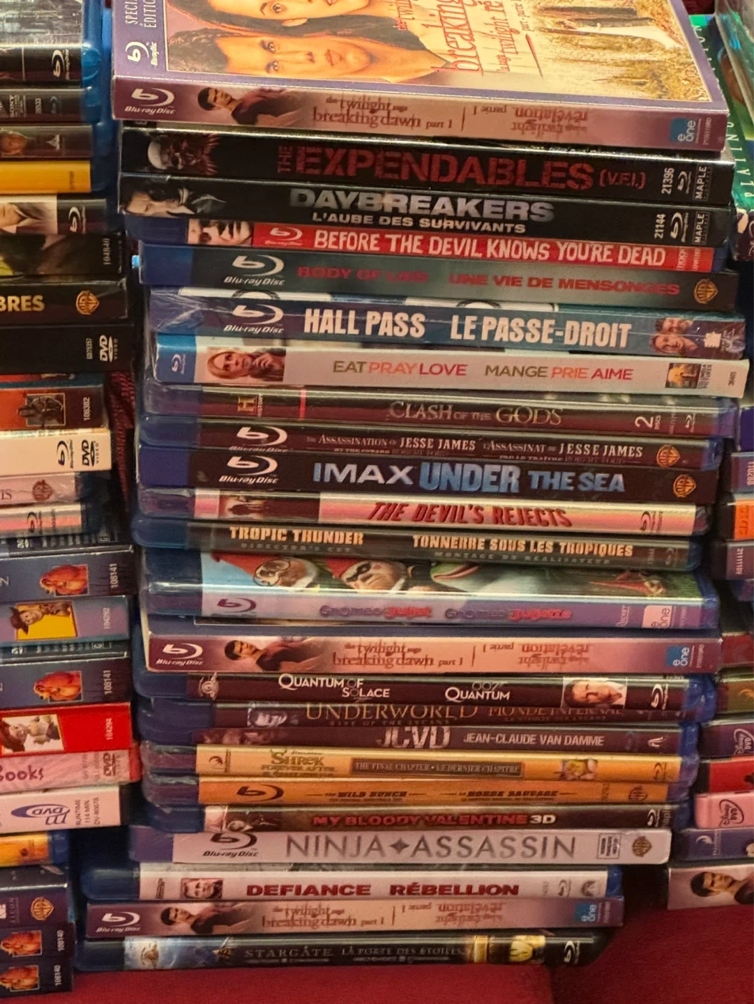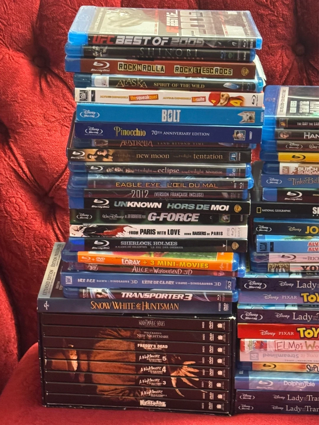 This is a large collection of Blu-ray and DVD movies across various genres. Titles include 'Avatar', 'Shrek', 'Toy Story' series, and many more. The collection offers a wide variety of entertainment options for movie lovers. Many of these are special editions and platinum collections.