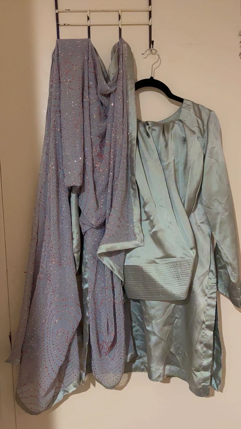 This is a three-piece women's outfit featuring a kameez, salwar, and dupatta. The kameez and salwar are a light grey raw silk material. The dupatta is a grey sheer fabric with scattered rose gold embellishments. It's suitable for special occasions like eid, desi/brown parties, gatherings , iftar, parties n diwali
