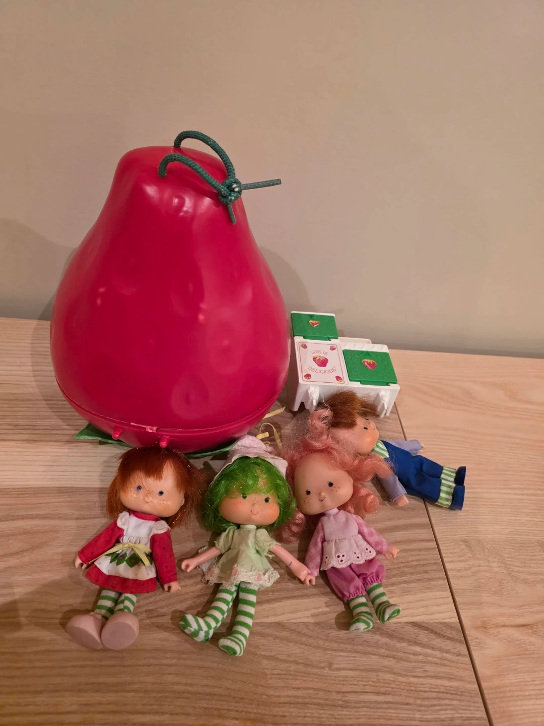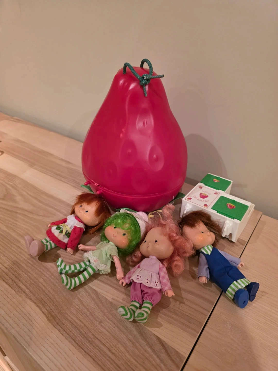 This set includes four Strawberry Shortcake dolls and their bright pink pear-shaped carrying case. The dolls have distinct outfits and hairstyles. It's a fun collectible or playset for fans of the classic character.