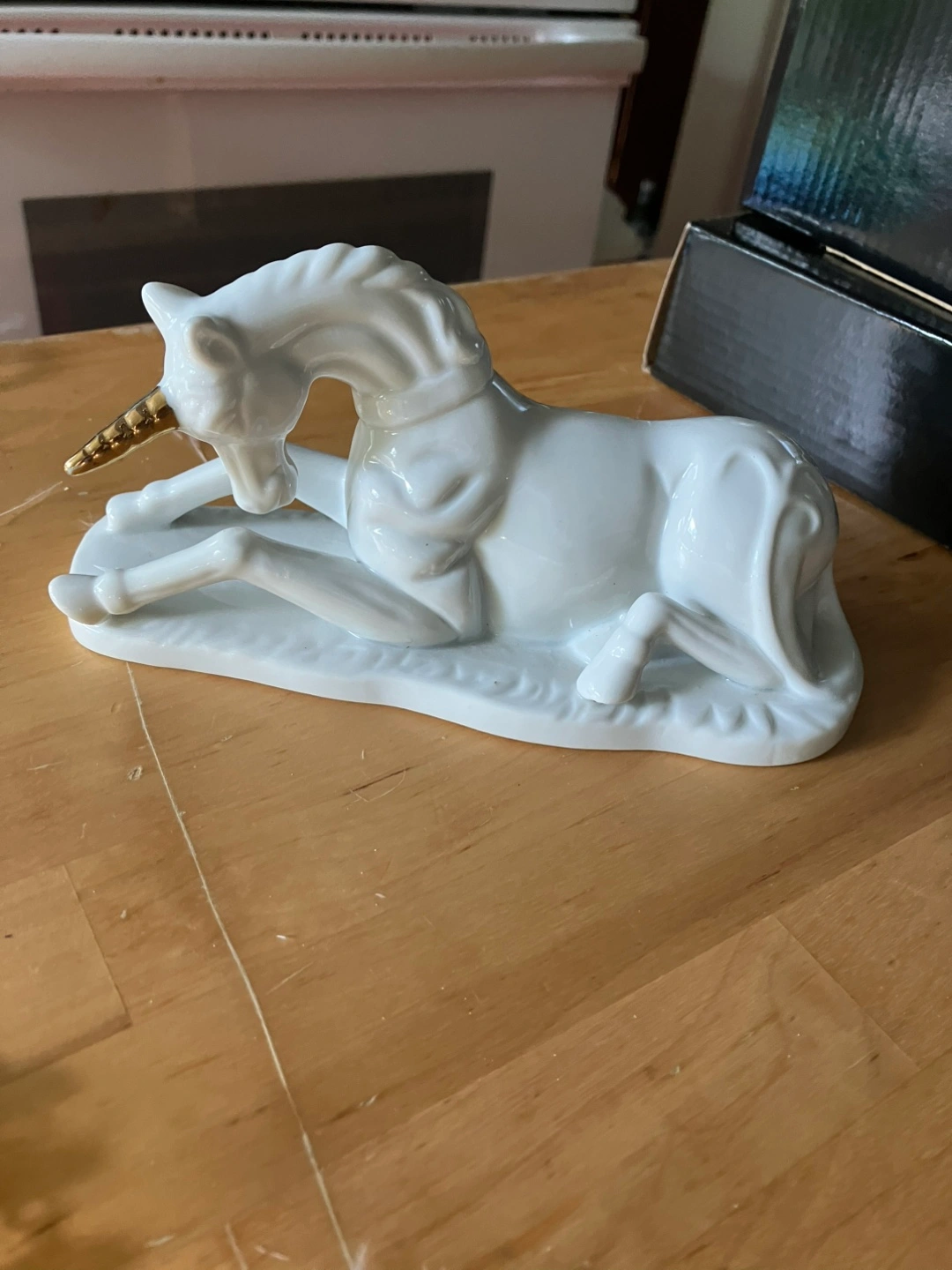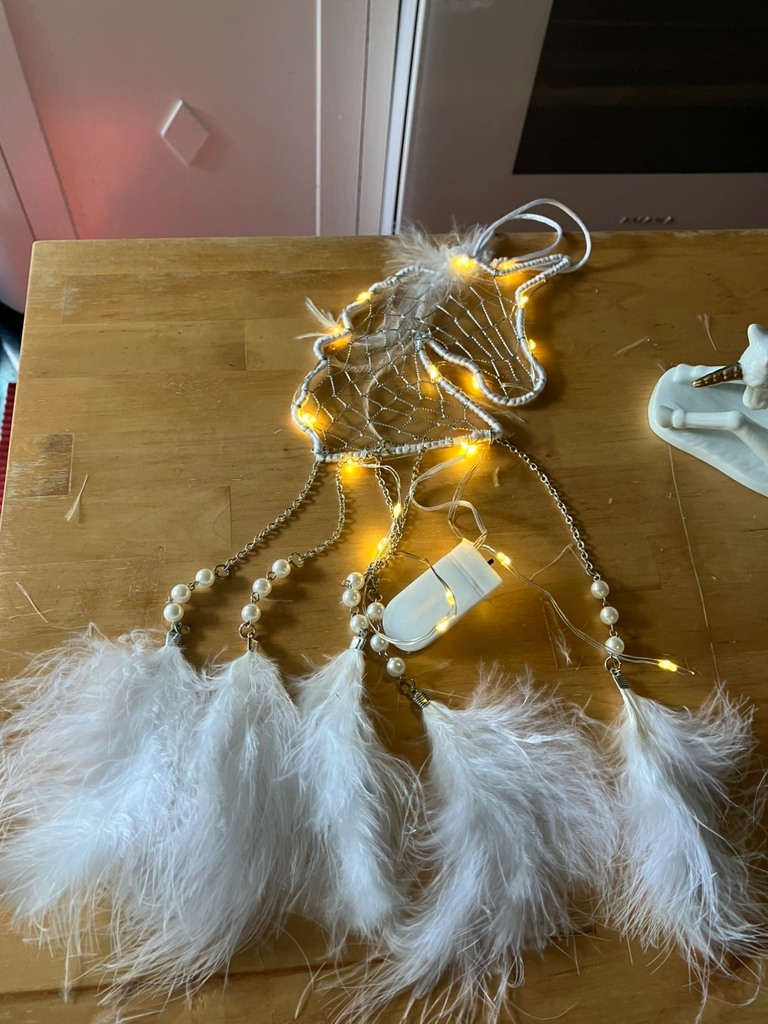 A lovely unicorn dreamcatcher with lights and feathers. Also a detailed white porcelain unicorn figurine. Perfect for your bedroom, for a touch of whimsy.