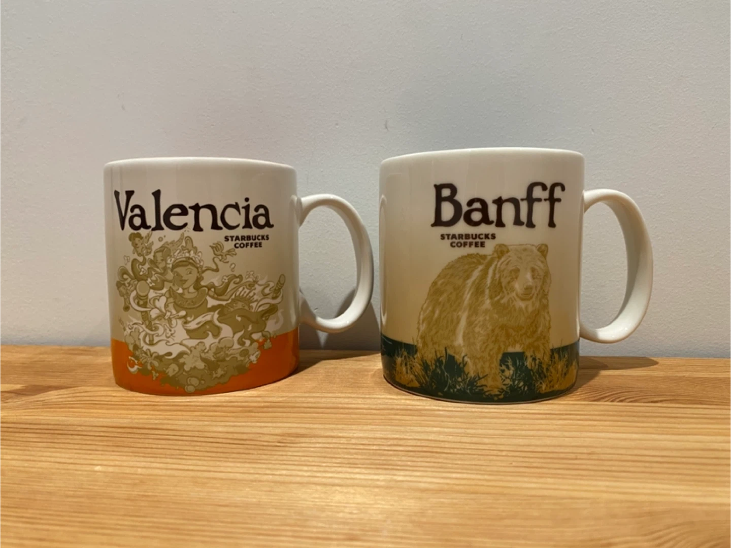 Two Starbucks coffee mugs, one featuring "Valencia" with intricate art and the other "Banff" with a bear illustration. Both are ceramic and great for enjoying your morning brew.