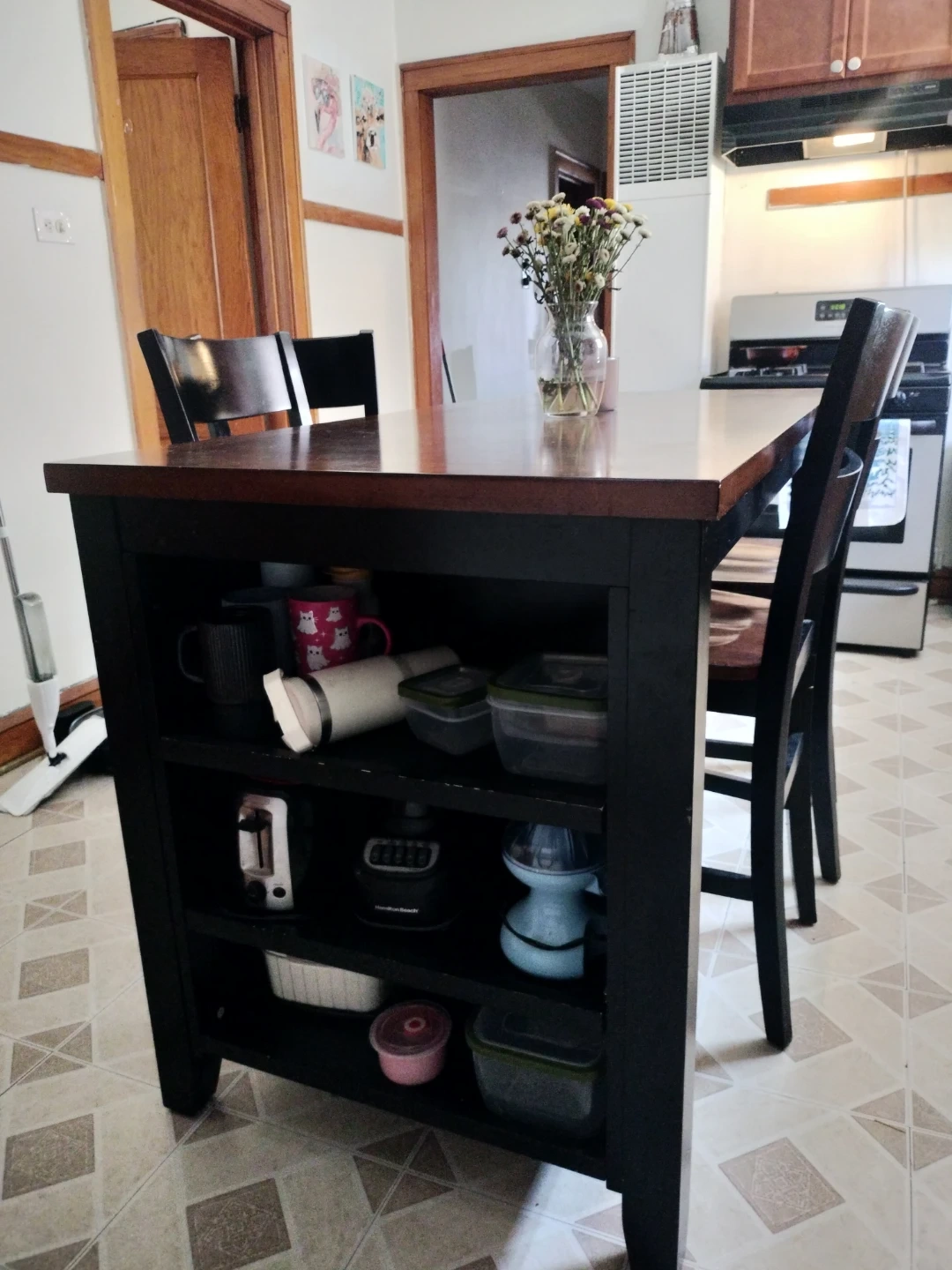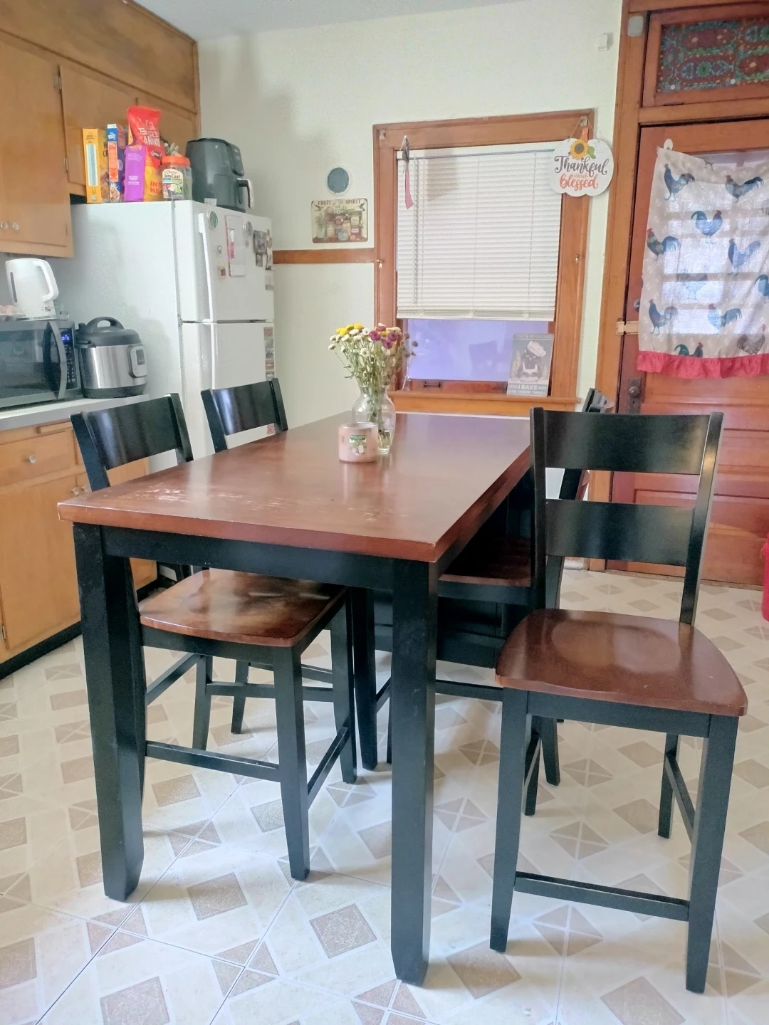 This dining set includes a table and four chairs. The table is dark brown wood top with black legs and storage shelves. Chairs are also black with dark brown seats. It is lightweight and easy to move.