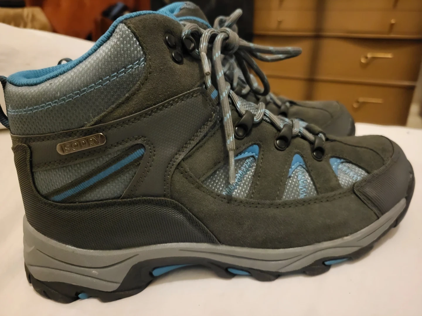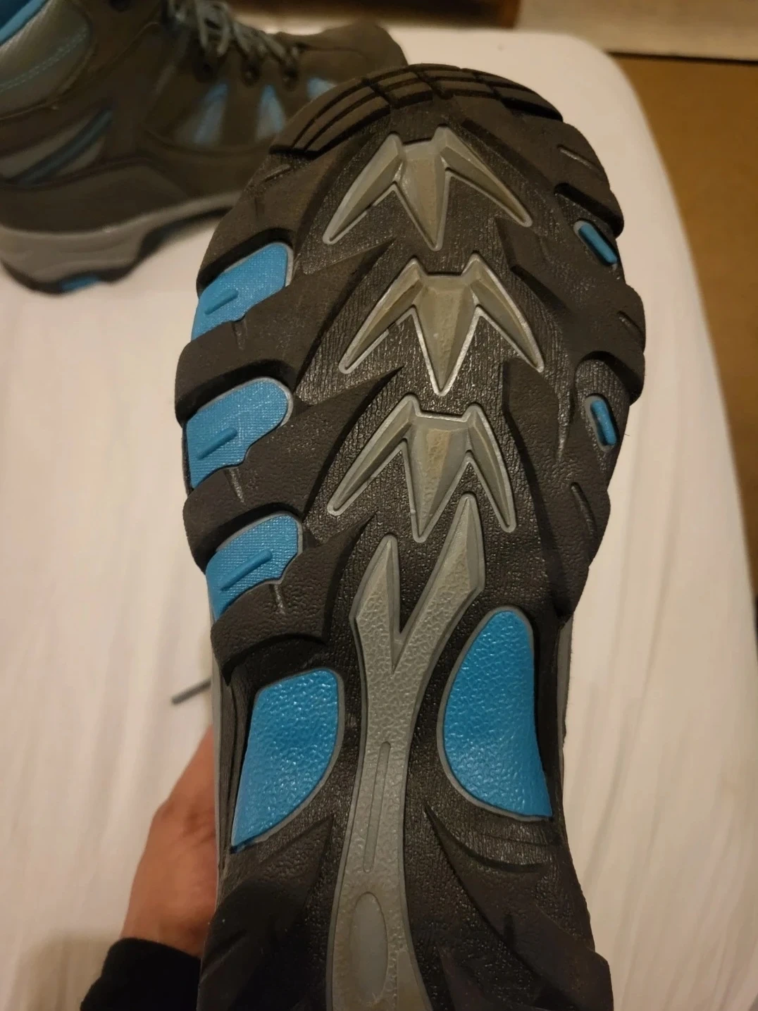 Grey and blue Mountain Warehouse hiking boots with a sturdy sole. Women's size 8 UK, 10 US, 41 EUR. Great for hitting the trails!