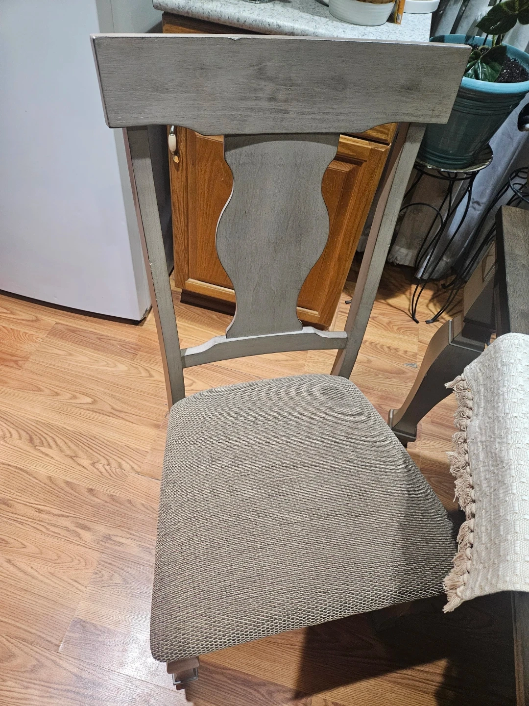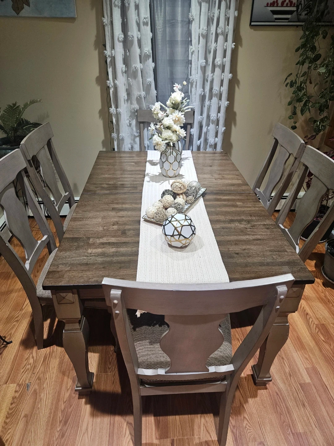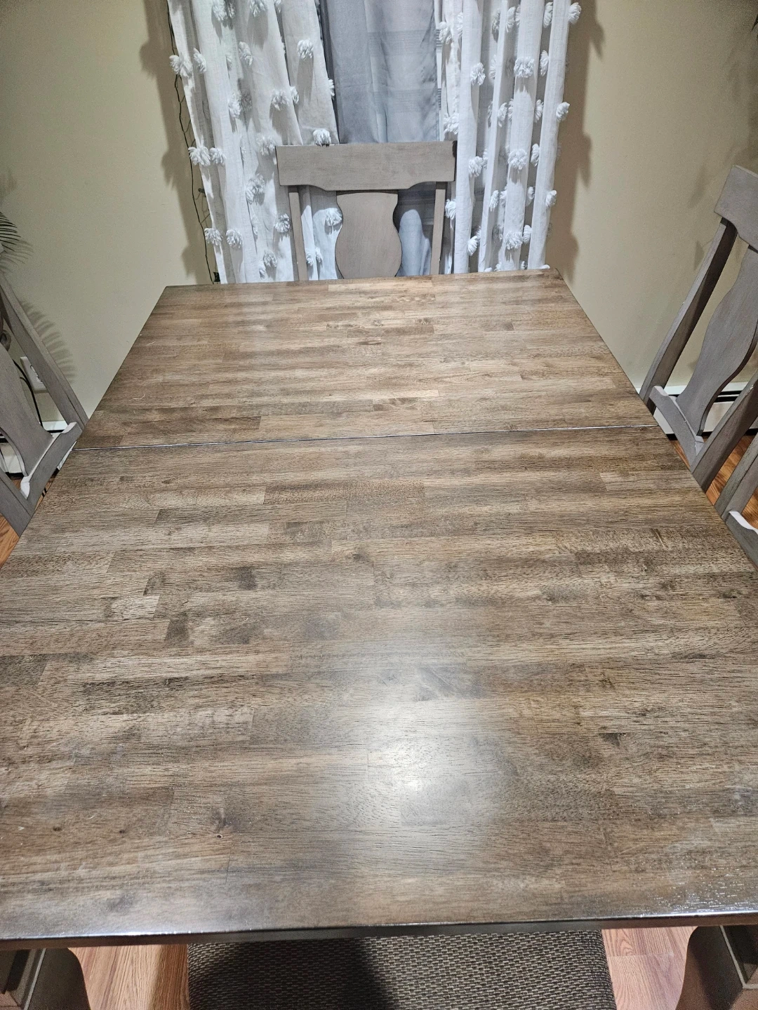 This dining set features a rustic-style table with a weathered wood finish and four matching chairs. The chairs have upholstered seats for added comfort. It's perfect for family dinners or entertaining guests. Table is extendable.
