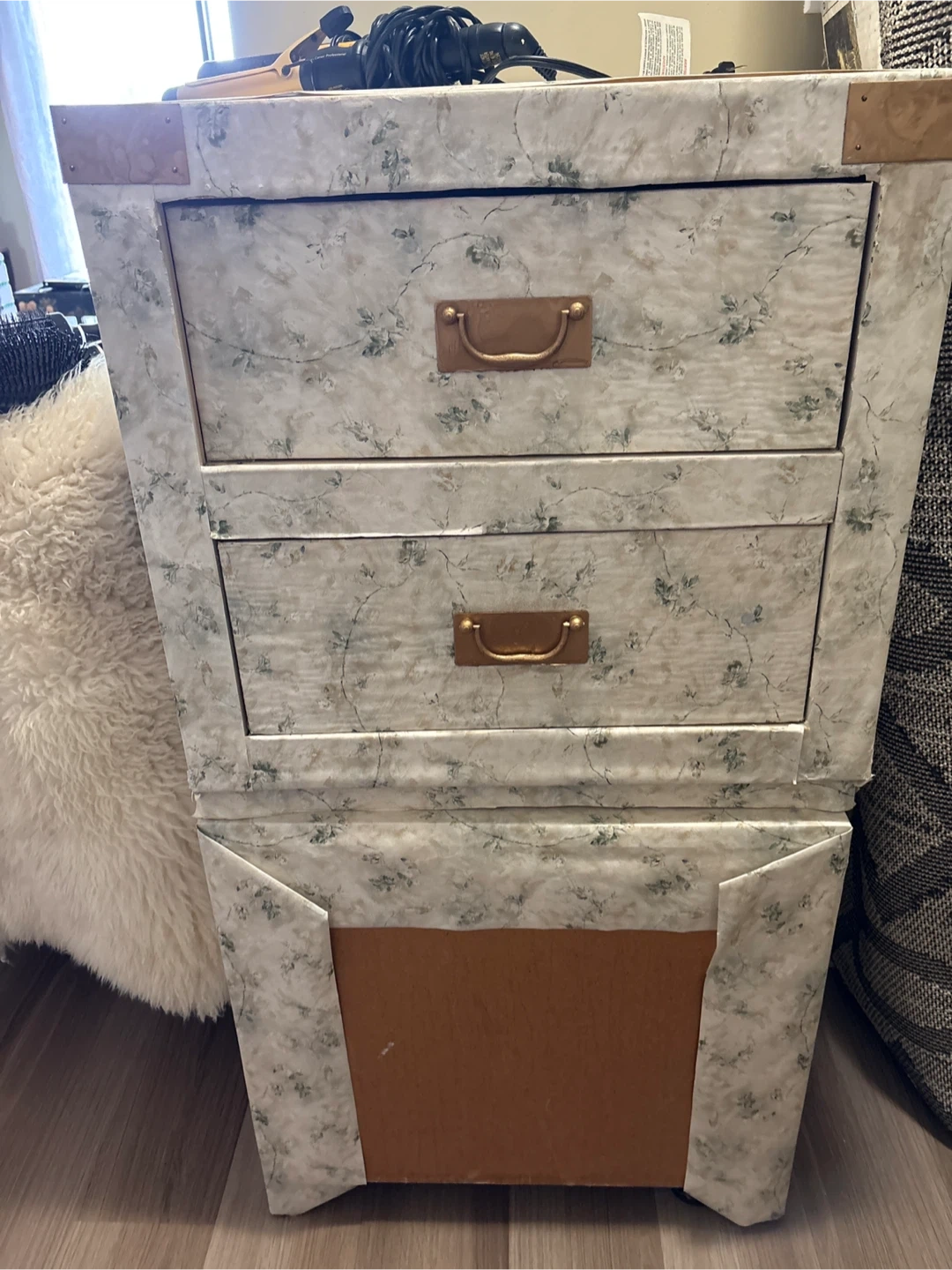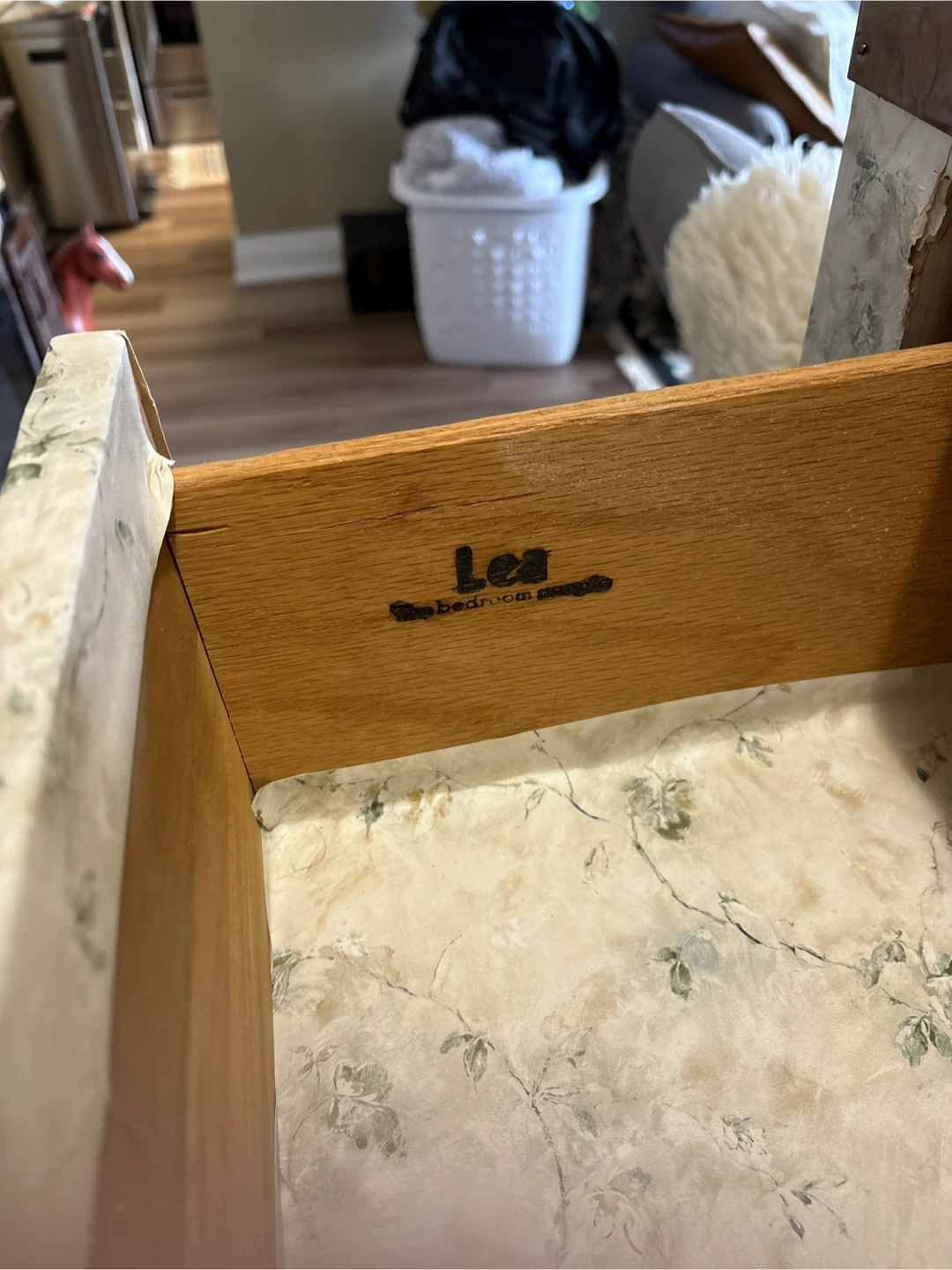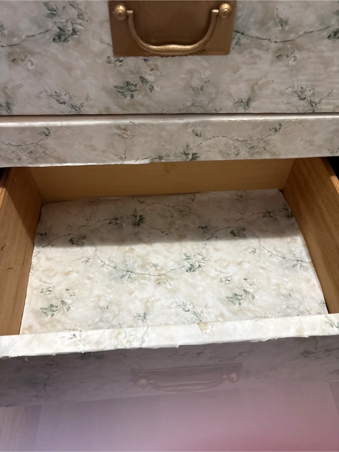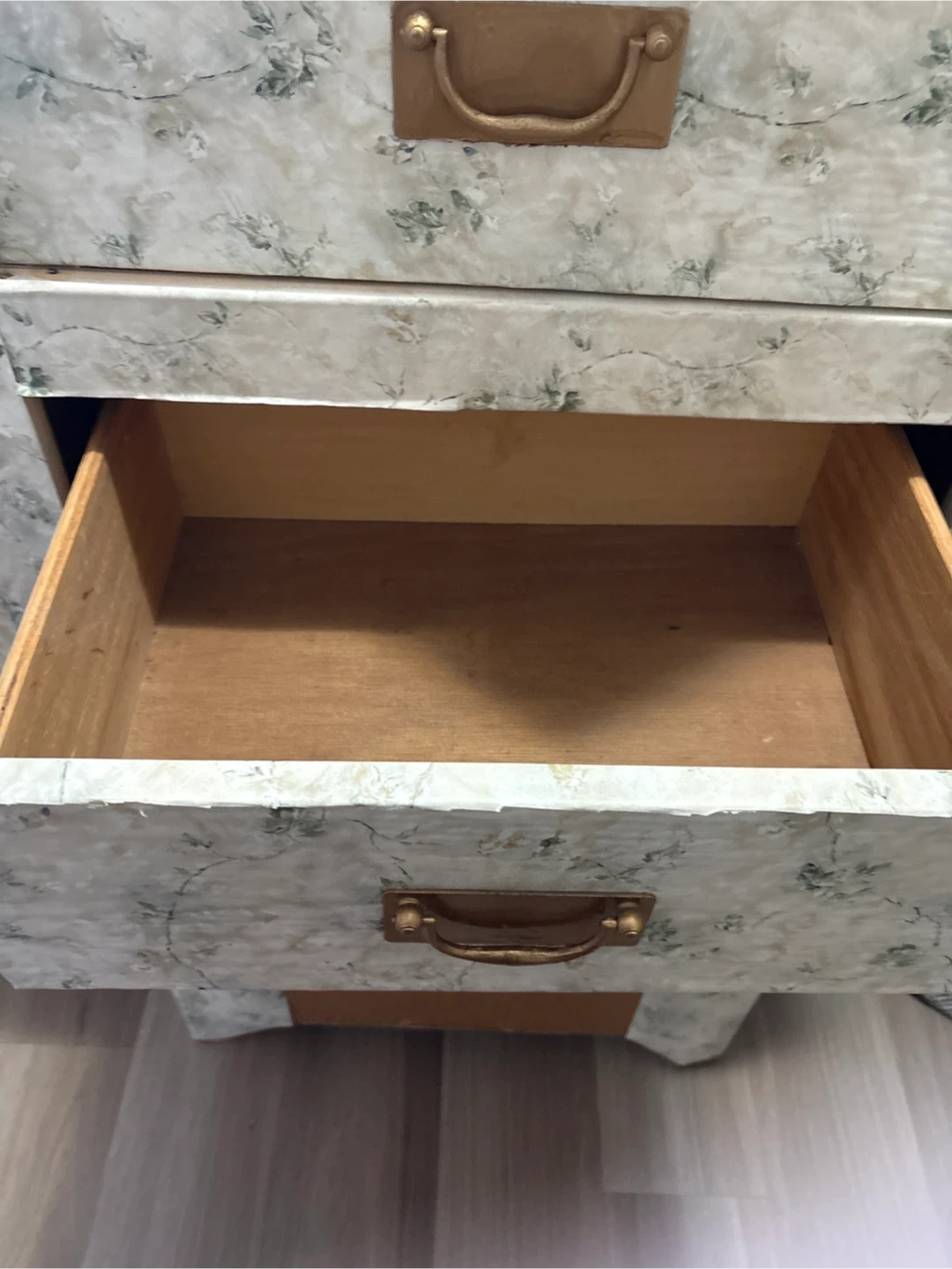 Two drawer nightstands from Lea Industries. It features a floral wallpaper design on the exterior and wooden drawer interiors. Drawer dimensions are approximately 14 inches wide and 7 inches deep. The wallpaper can be removed it’s white underneath the wallpaper.