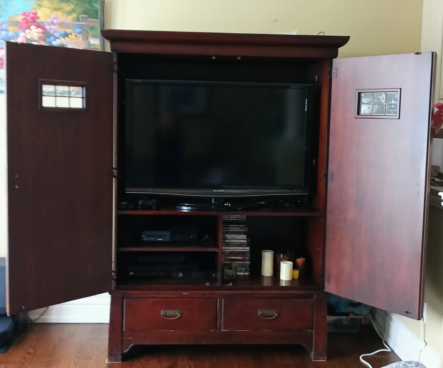 A sturdy wooden entertainment unit in a deep cherry finish. It features two doors with decorative glass inserts and two lower drawers for storage. The interior is designed to hold a television and media components.