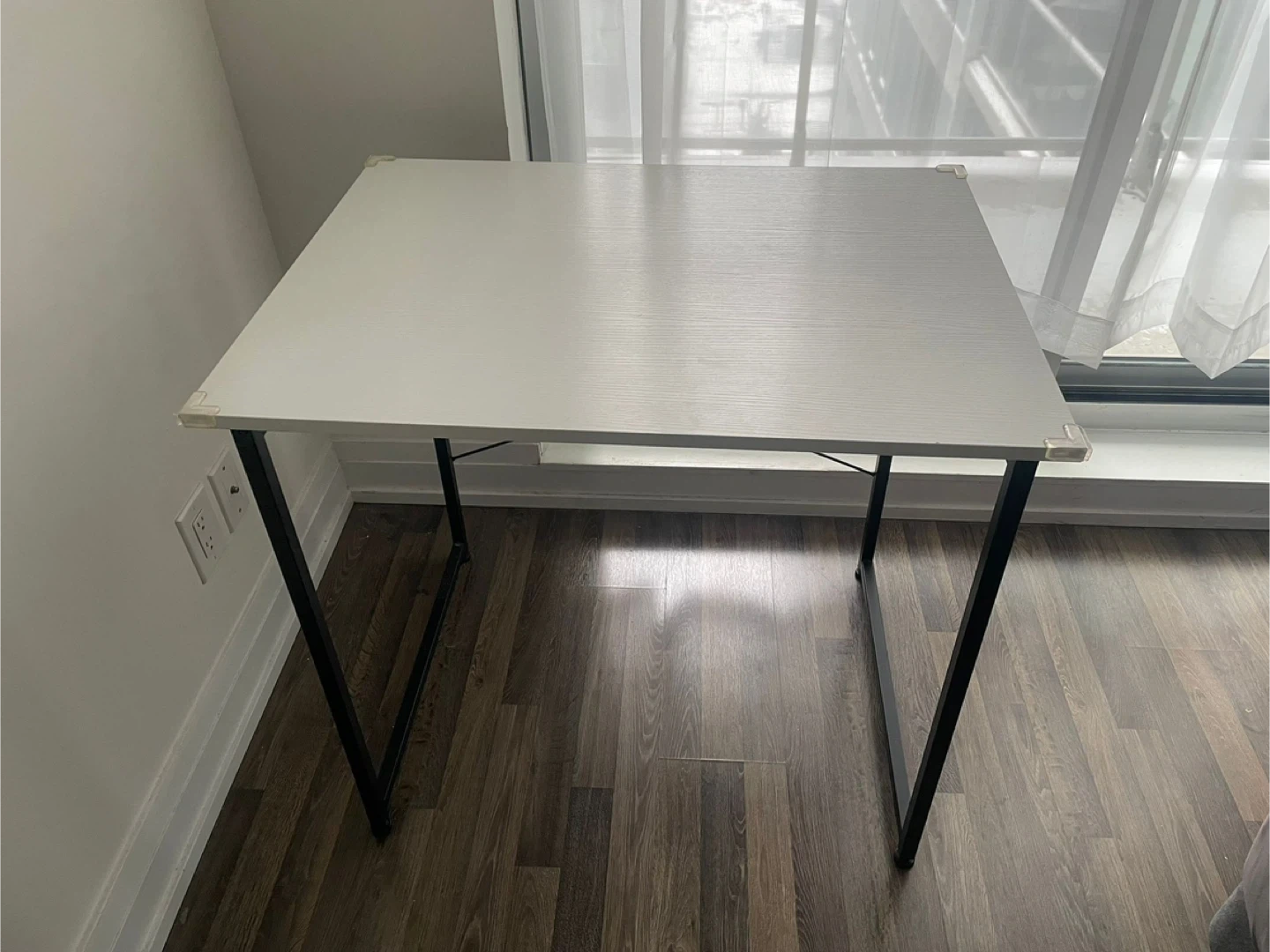 A minimalistic white work/study desk with a black metal frame. It's easy to set up and put away. This desk is great for a home office set up.