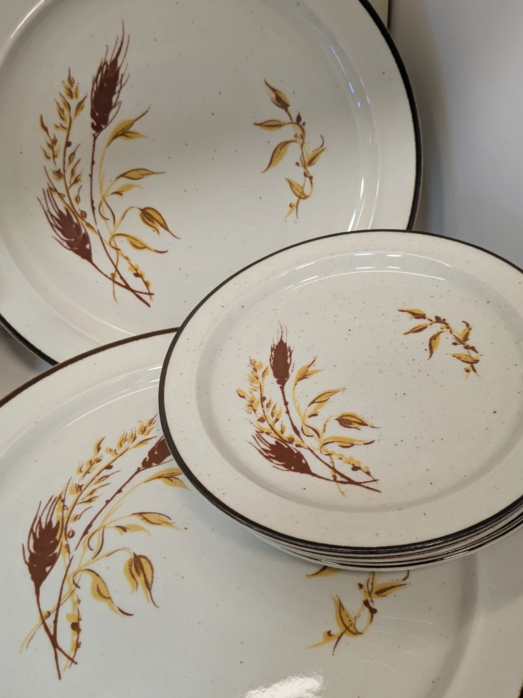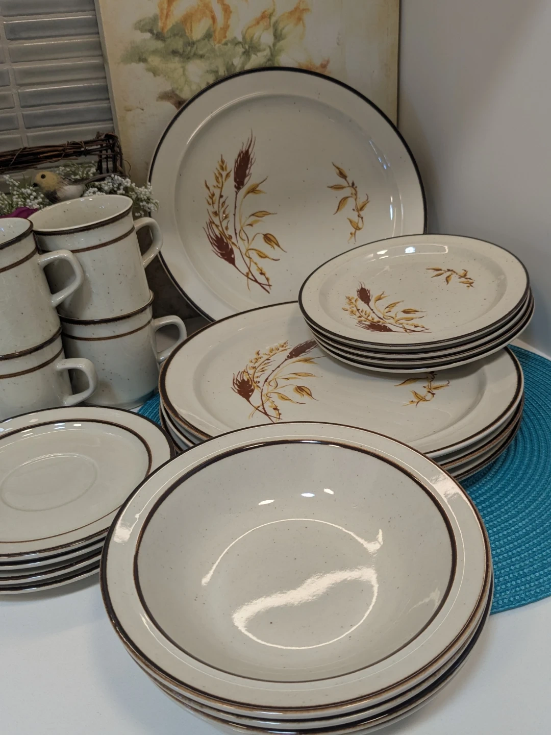 features a speckled cream base with a delicate wheat stalk design and a brown rim. It includes multiple plates, bowls, and cups, perfect for everyday use or special occasions. Add a touch of rustic charm to your table setting!