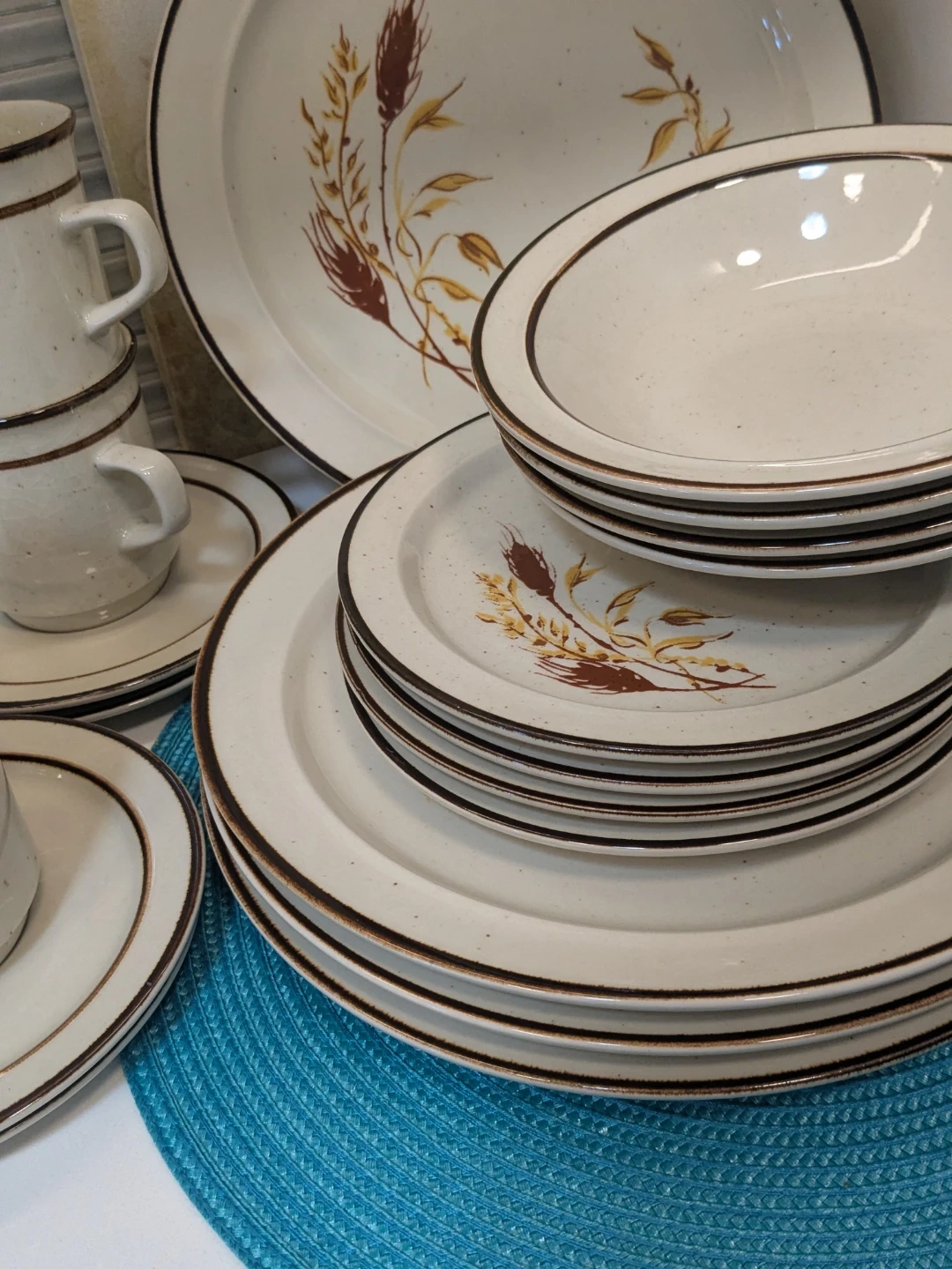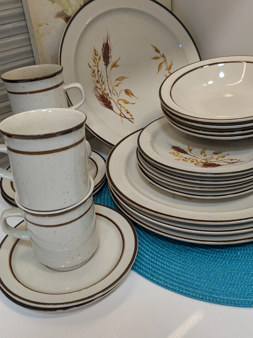 Vintage Speckled Wheat Pattern Dinnerware Setting for 4