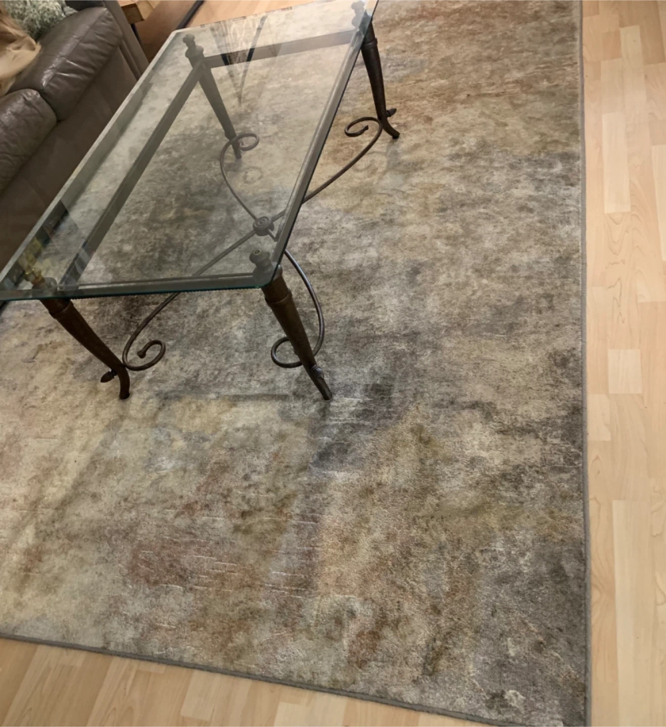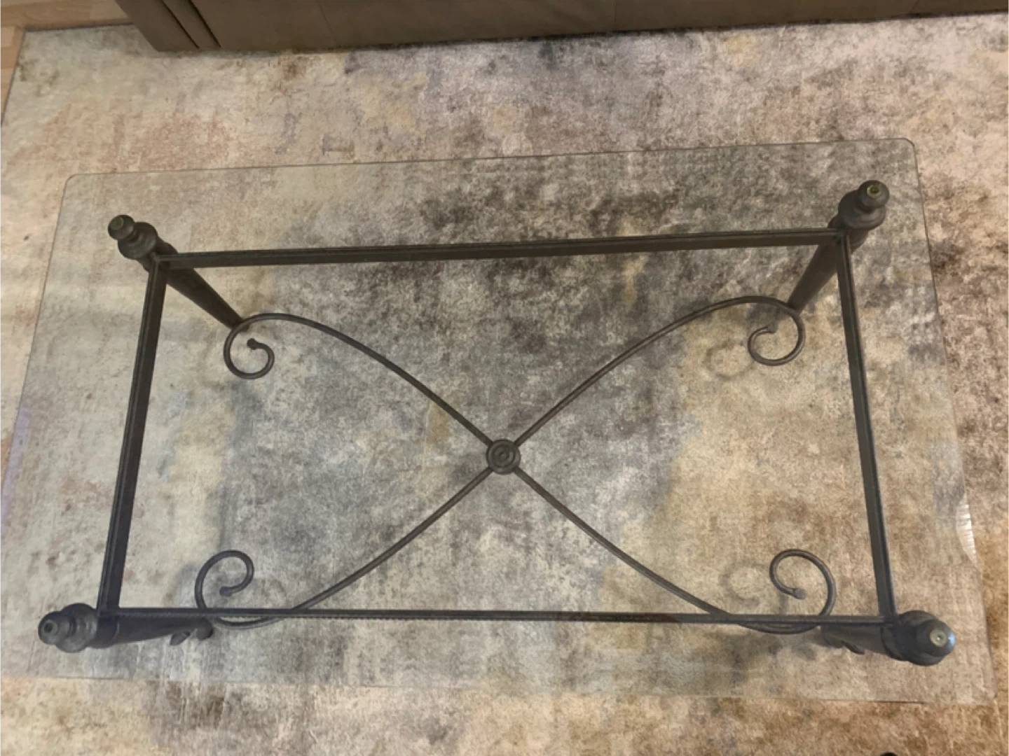 Rectangular glass top coffee table with a dark metal scroll base. It's a sturdy piece for your living room. Glass top and metal frame construction.