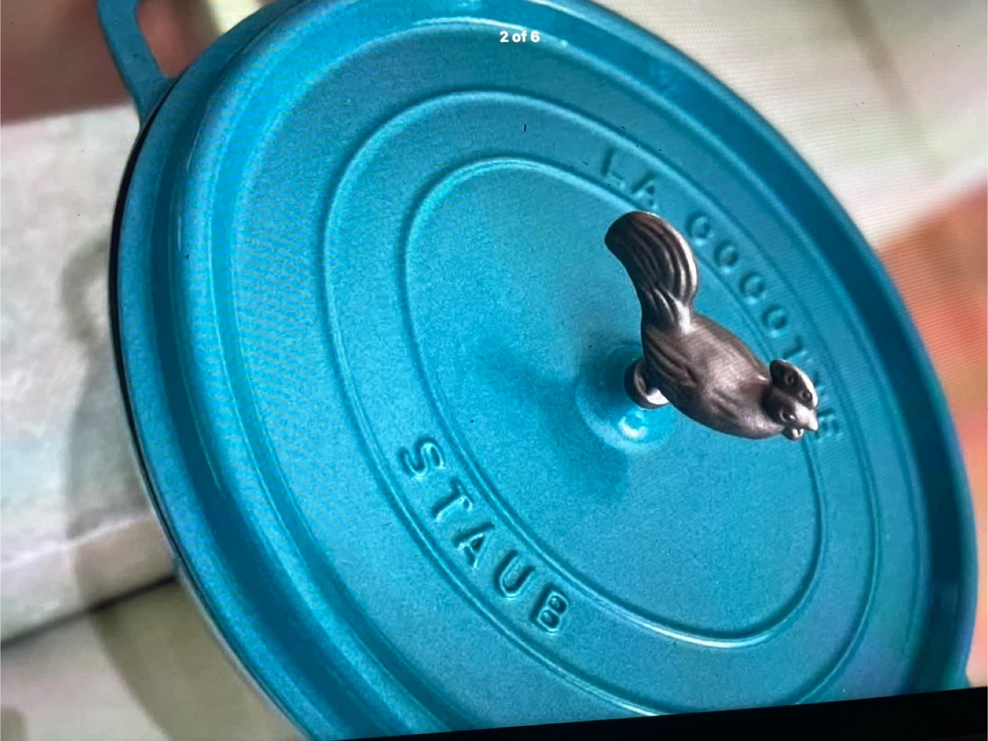 A teal Staub cast iron cocotte with a unique rooster-shaped lid pull. This piece is perfect for braising, simmering, and roasting. It's a beautiful addition to any kitchen for everyday cooking or special occasions!