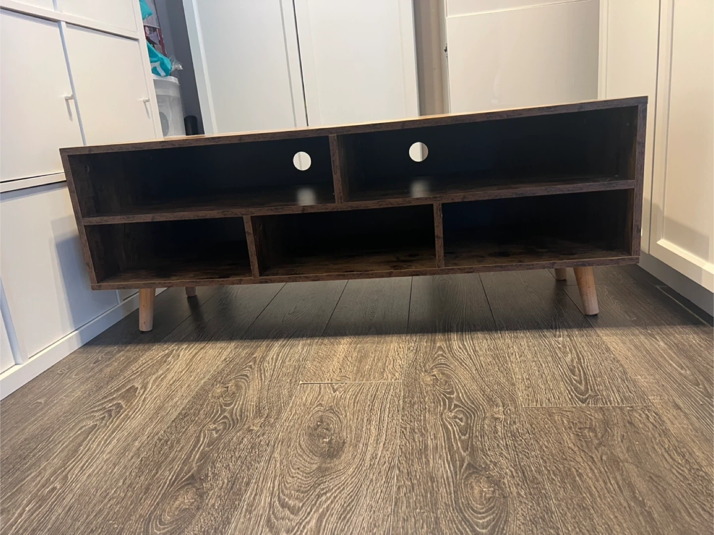 This rustic brown TV stand is perfect for adding a touch of warmth to your living room. It features open shelving for storing your media devices and accessories. The console table design offers a stylish and functional addition to your home decor