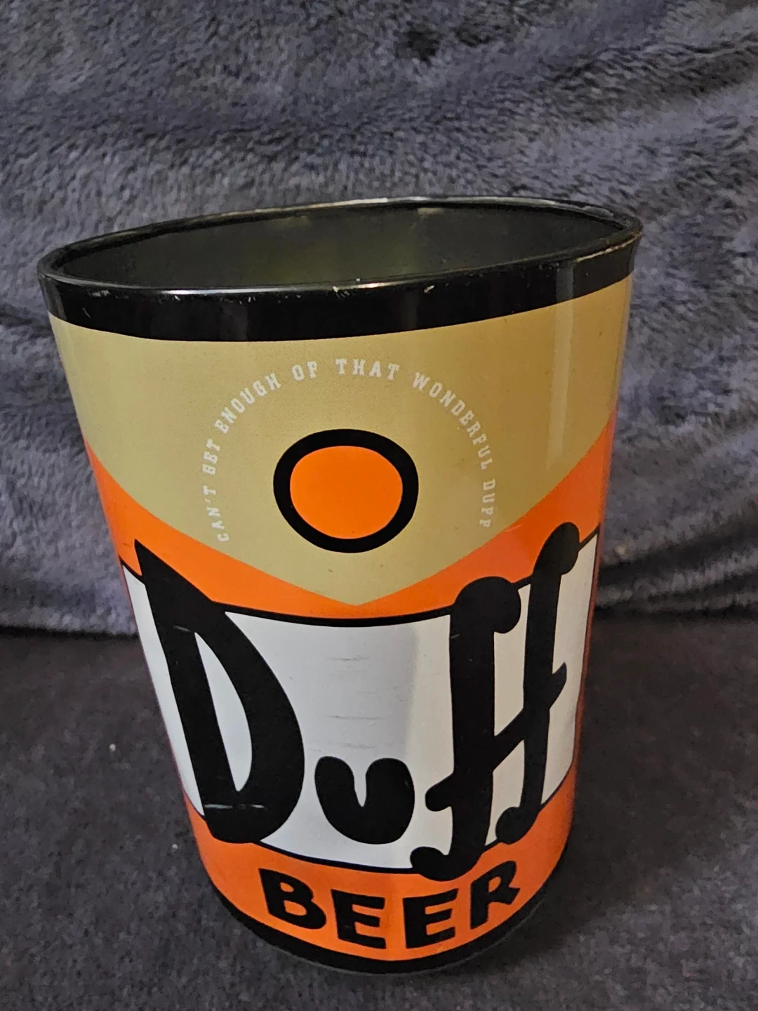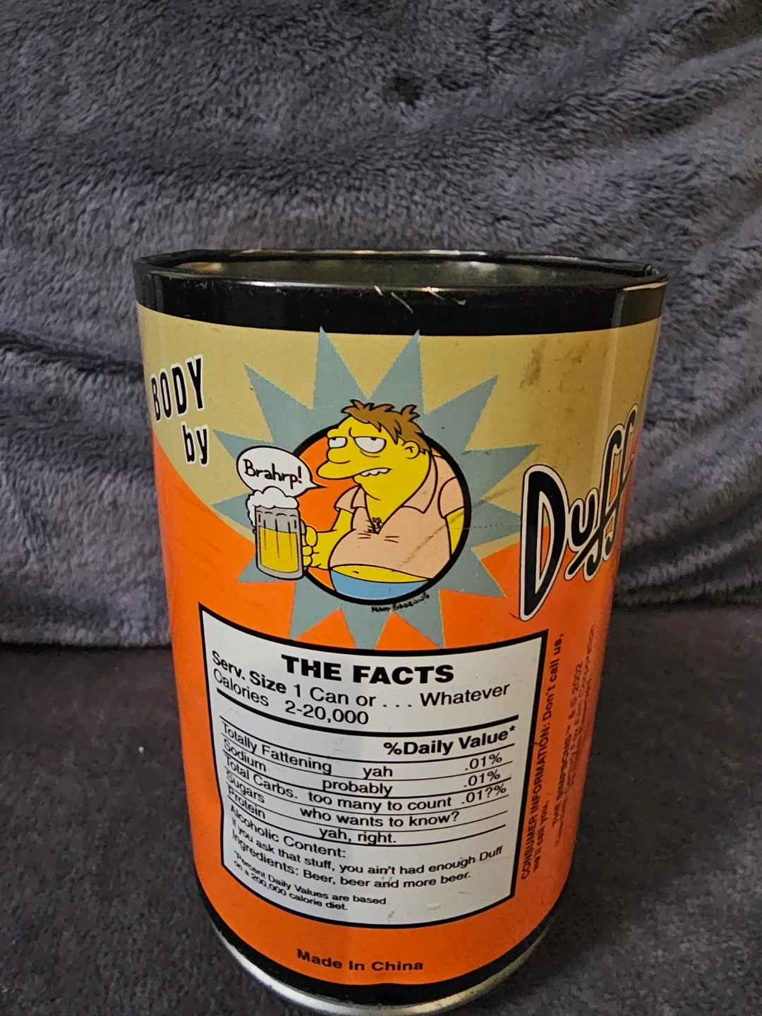 This Duff Beer tumbler features a classic design with Barney Gumble on one side. It's a fun collectible for fans of The Simpsons. The inside shows nutritional facts for "Whatever" calories.