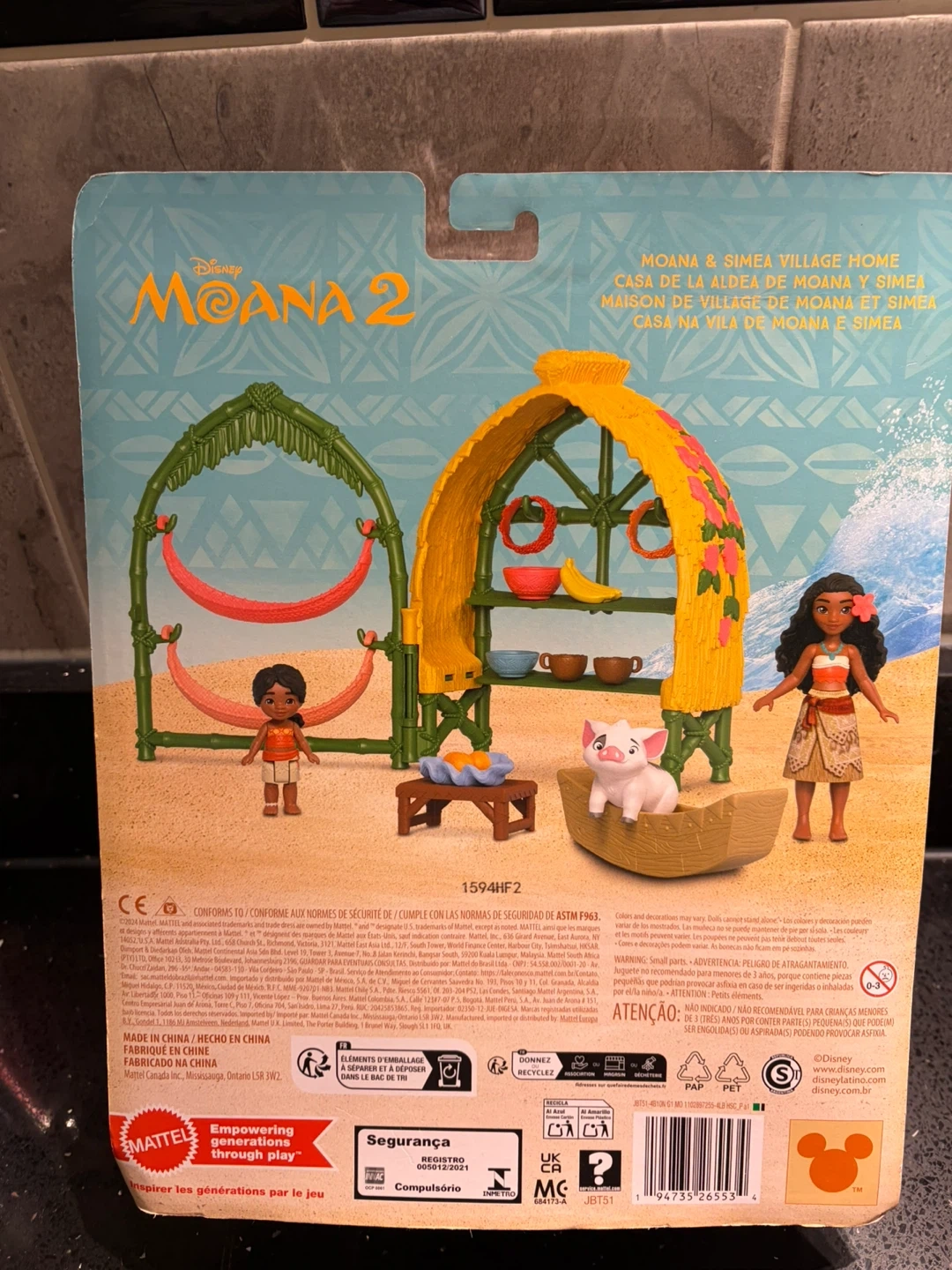This Moana & Sima Village Home playset from Disney Moana 2 includes Moana and Sima figures, Pua the pig, a village hut, and various accessories. It's recommended for ages 3 and up. Bring the adventures of Moana to life with this fun playset!
