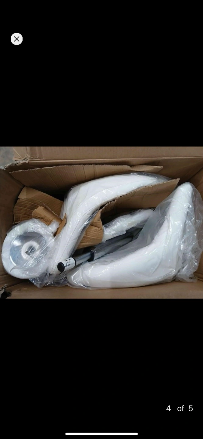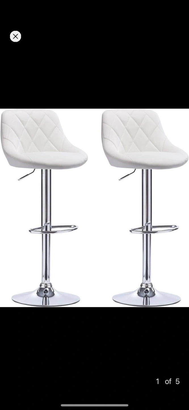 Two like new bar stools. White faux leather seats. Chrome metal base. Adjustable height. Easy assembly required. Modern design. Perfect for kitchen island or bar.