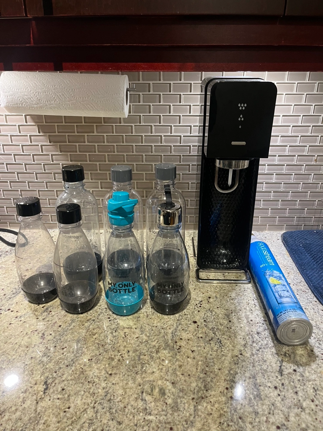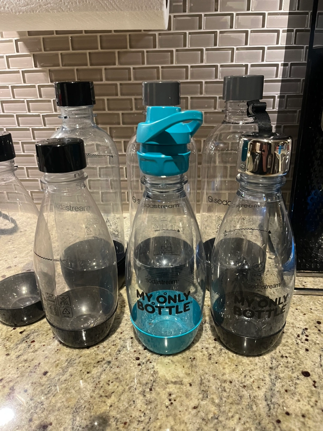 Several Sodastream bottles, various sizes and colours. Includes one My Only Bottle brand bottle. One black Sodastream carbonation machine included. Includes two Sodastream canisters, one half full and one empty.