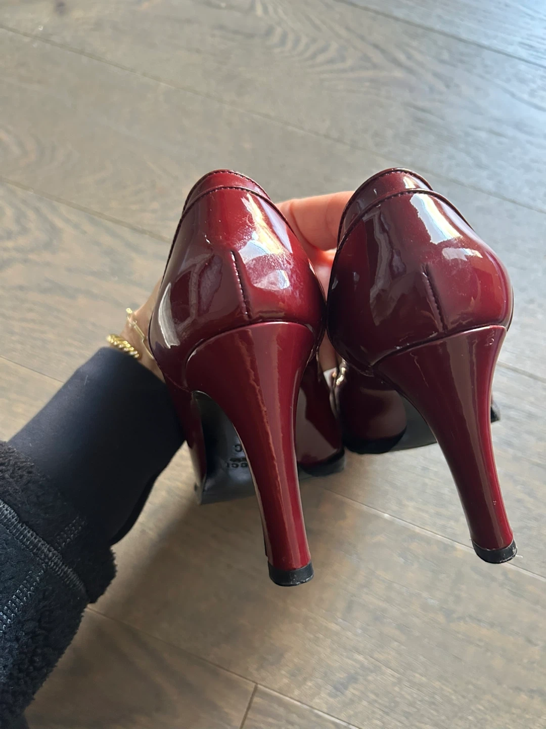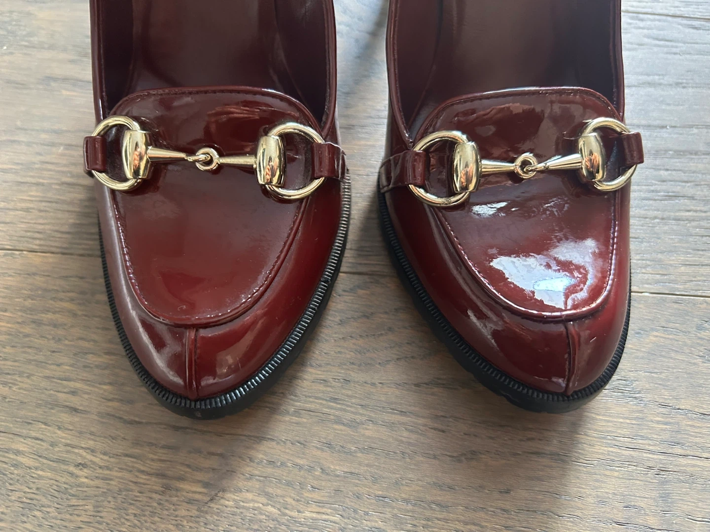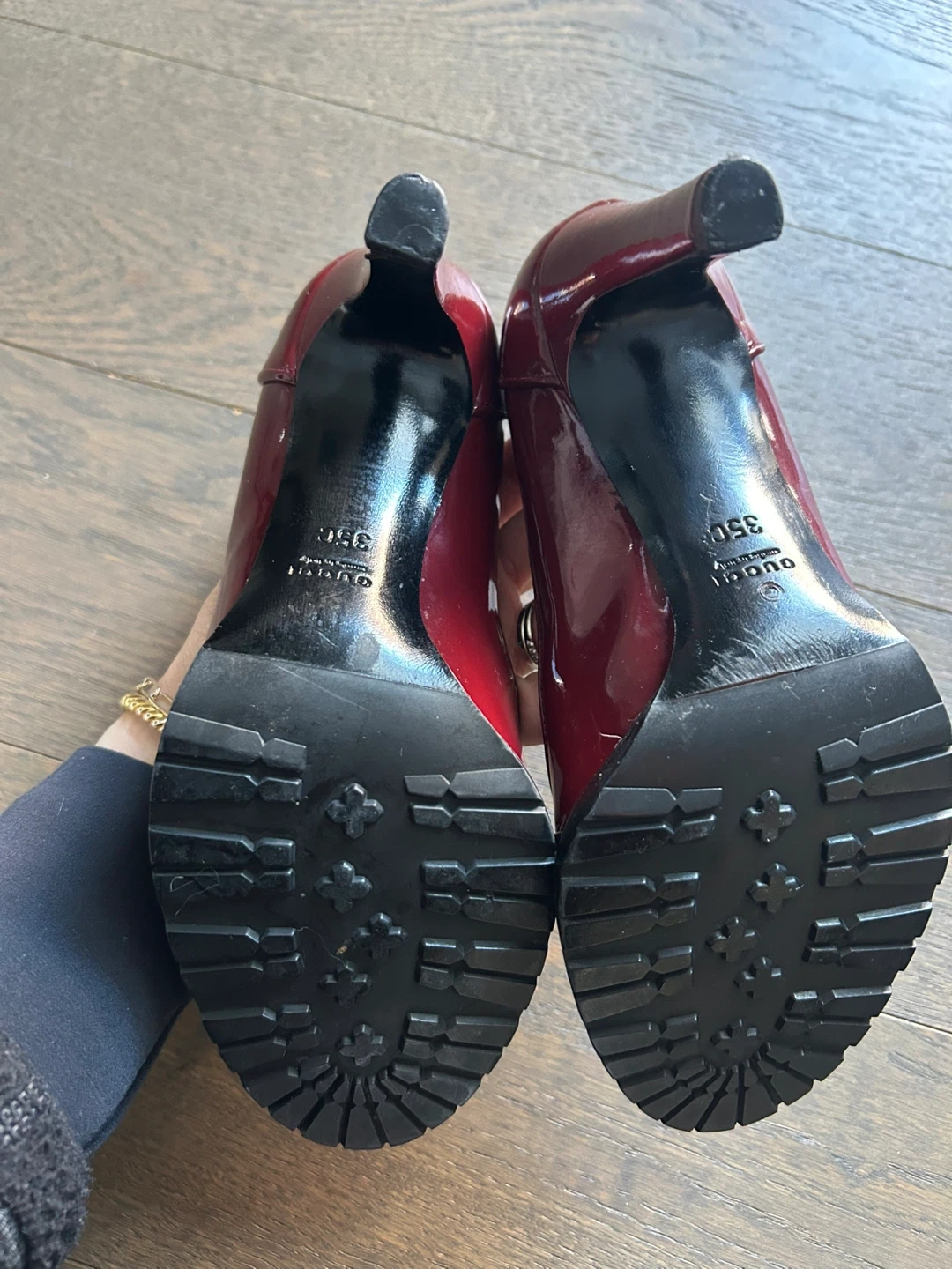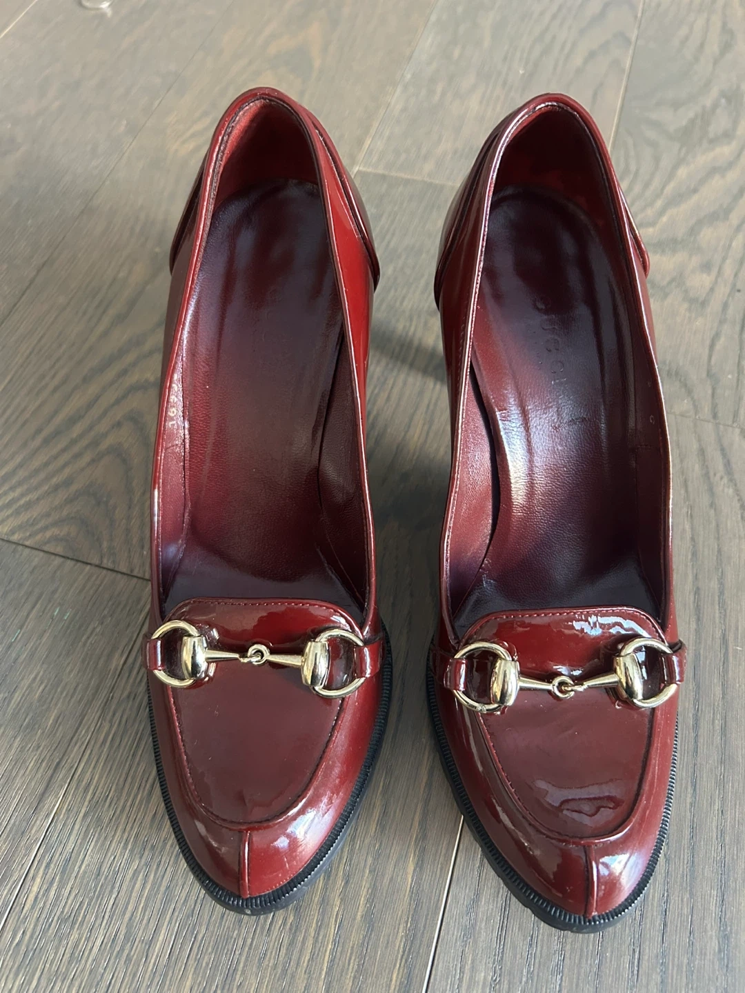 Gorgeous Gucci heels in a rich red patent leather. These shoes feature the iconic horsebit detail and a sturdy lug sole. Size 35.