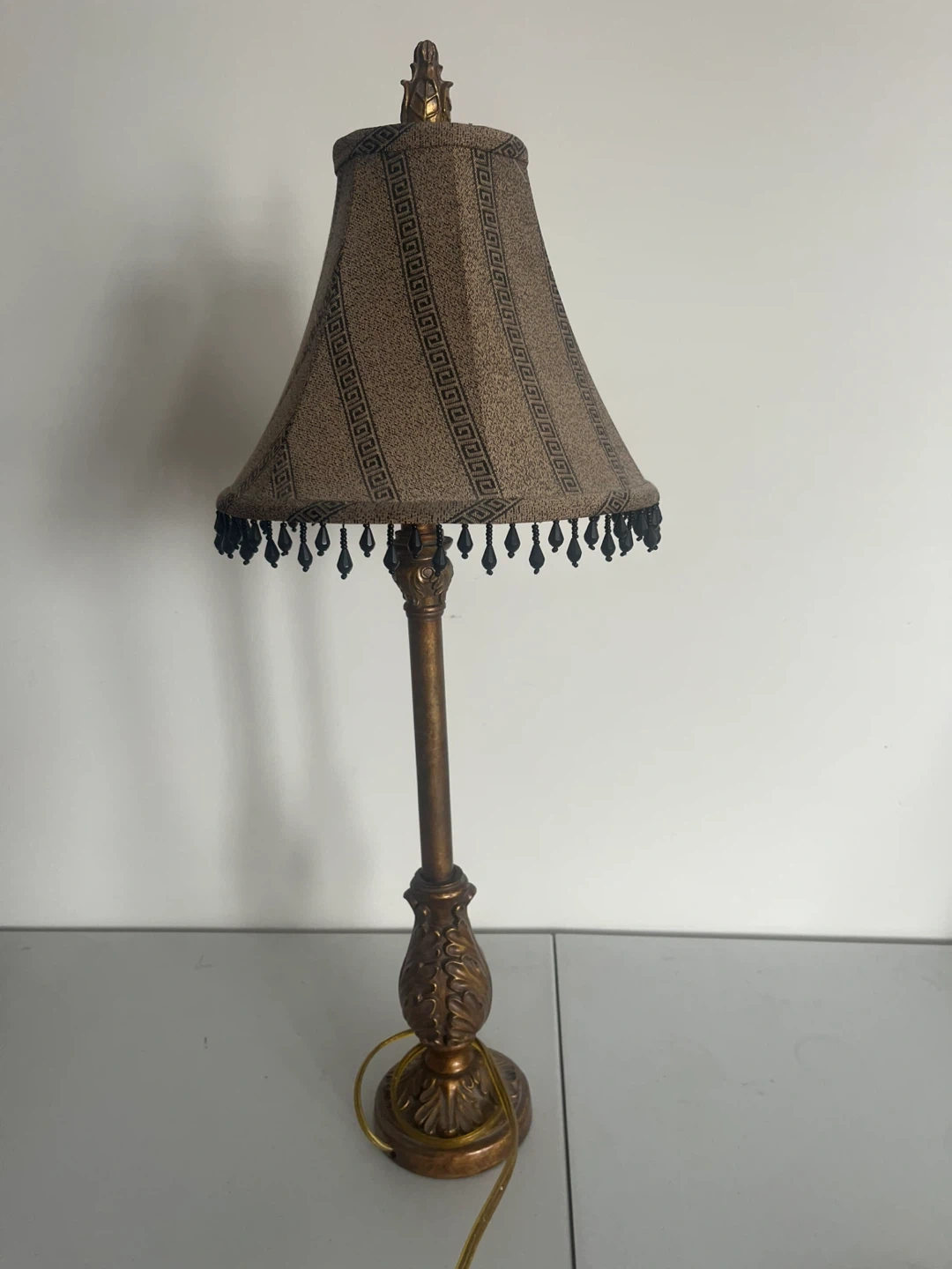 This is a decorative table lamp with a fabric shade featuring a Greek key pattern and black beaded trim. The lamp's base and stem have an ornate, antiqued gold finish. It's a lovely accent piece for any room.