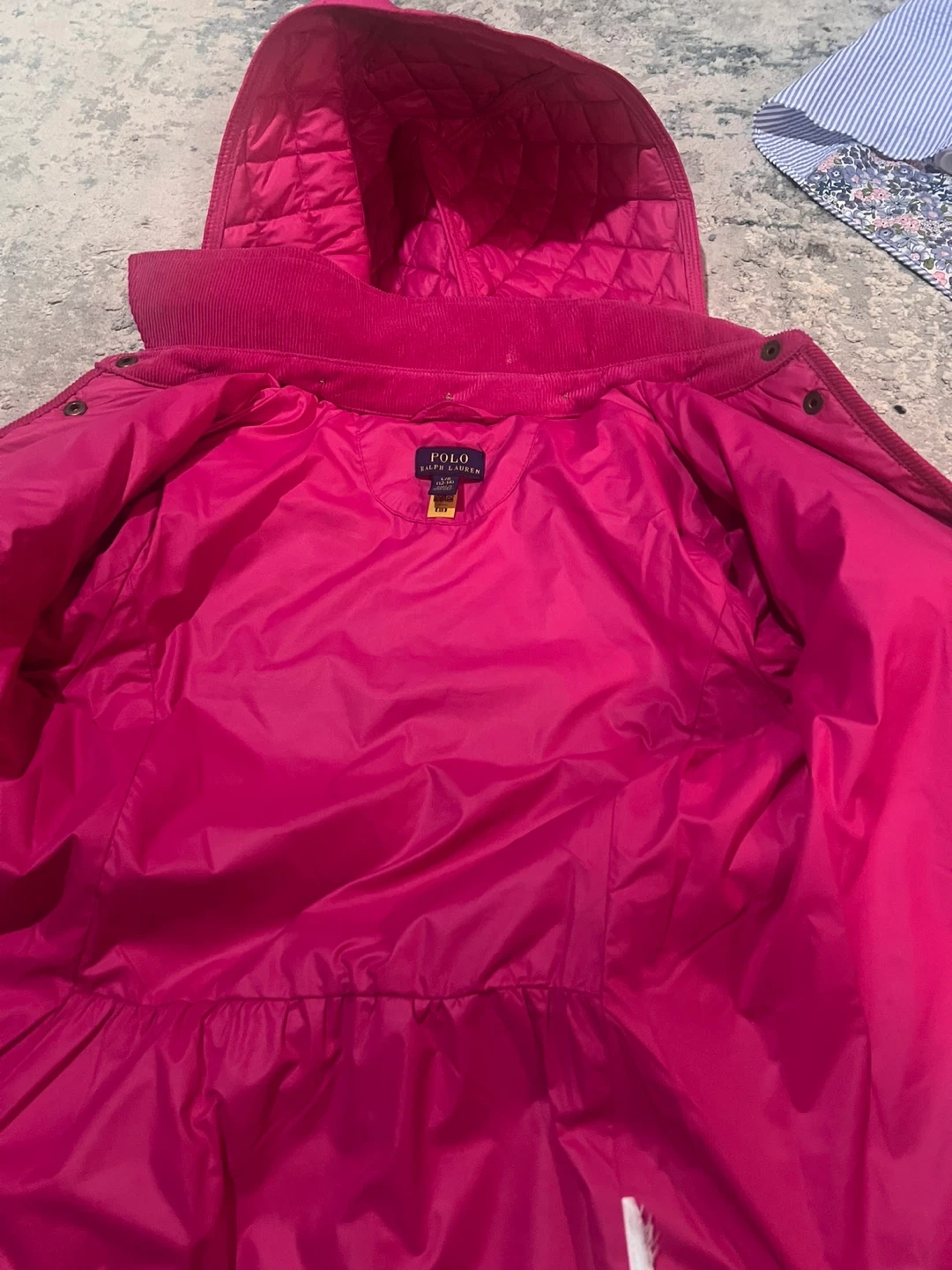 Selling a cute Polo Ralph Lauren quilted jacket in a vibrant pink color! It's a size L/G (12-14) and features a quilted design with a hood. Great for keeping warm and stylish!
