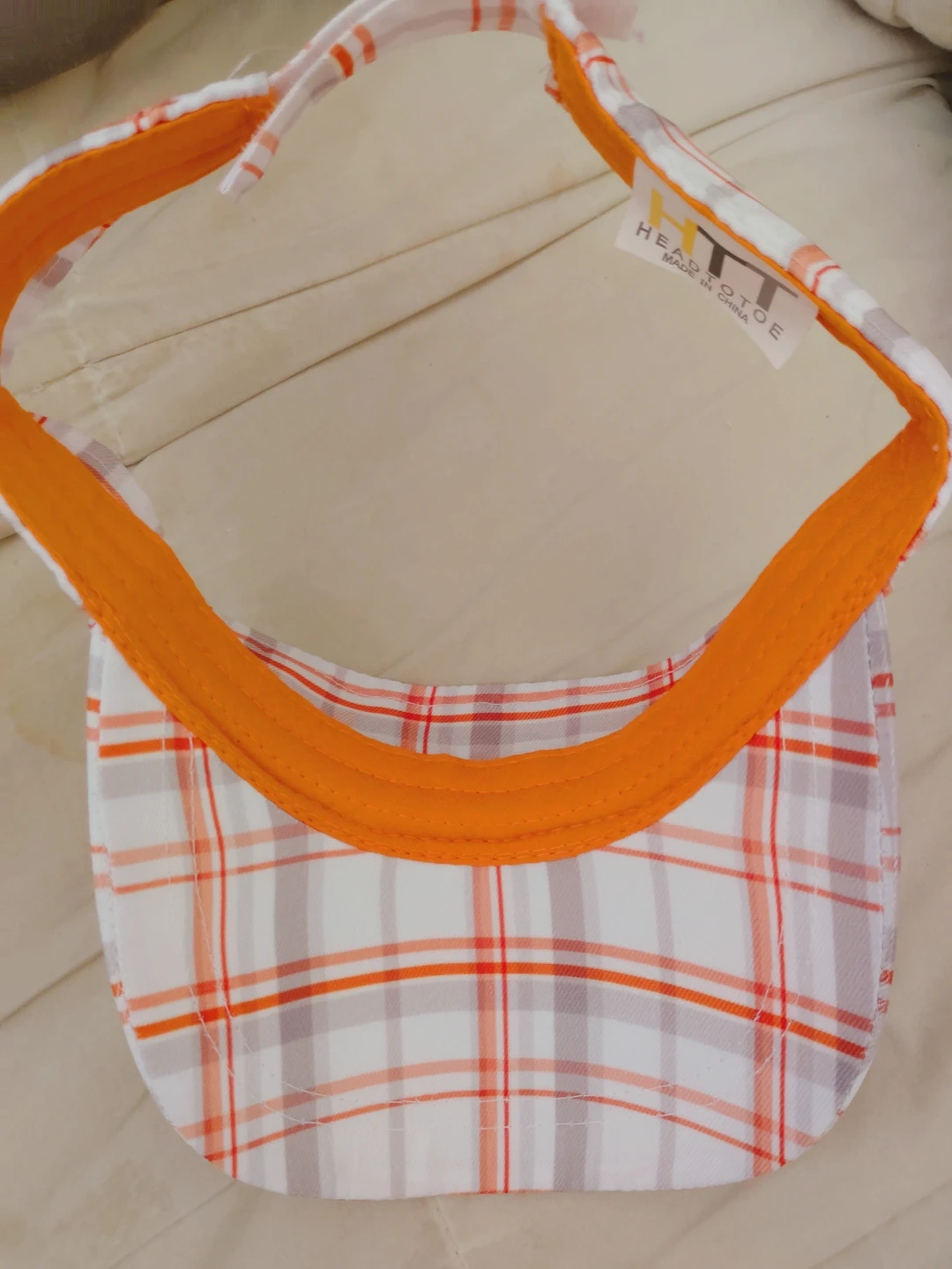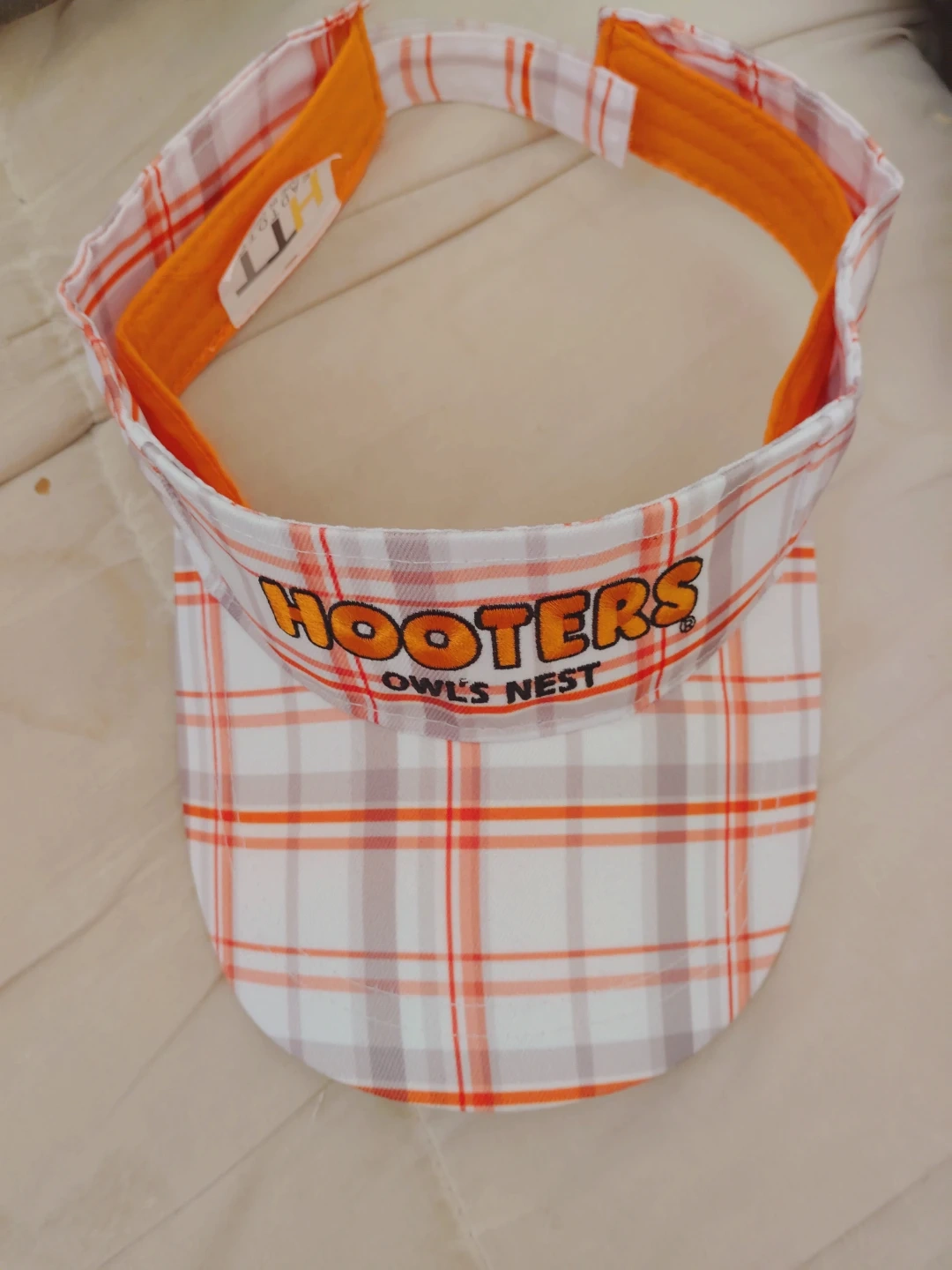This is a Hooters Owl's Nest visor. It features a plaid pattern with orange and white colors. The visor has an adjustable strap for a comfortable fit.