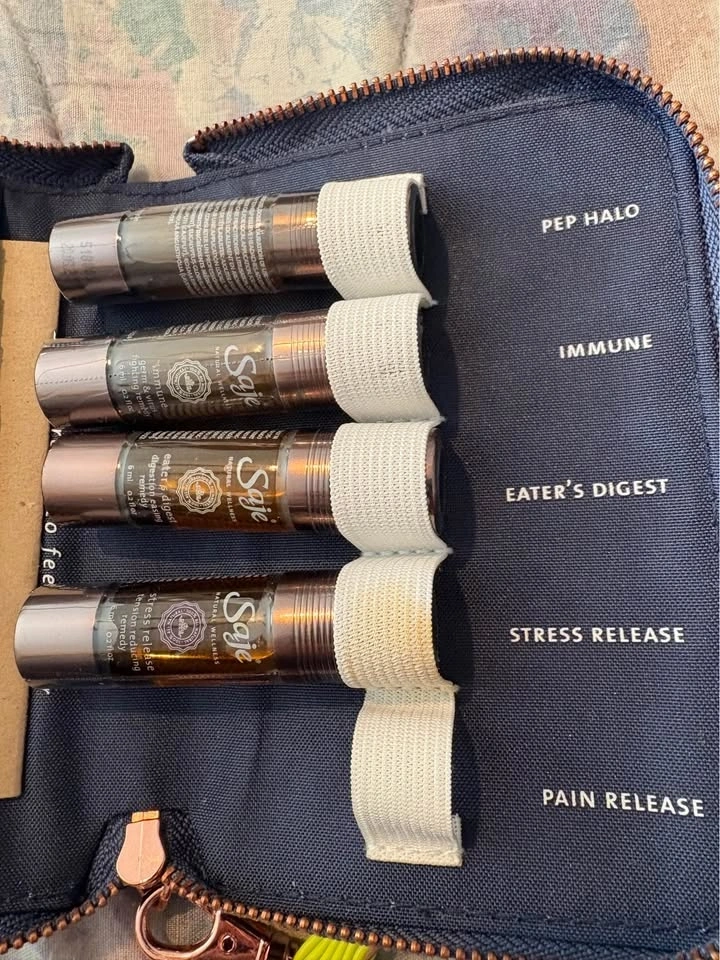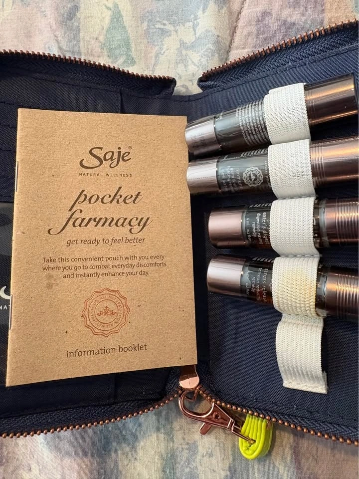 Handy Saje Pocket Farmacy kit. Has four essential oil roller bottles: Pep Halo, Immune, Eater's Digest, Stress Release. Comes in a navy blue faux leather pouch with a neon yellow wrist strap and rose gold zipper. Also includes info booklet. Great for natural wellness on the go. Pickup/ cash only. SE Vancouver. Victoria Drive & E 61 Ave.