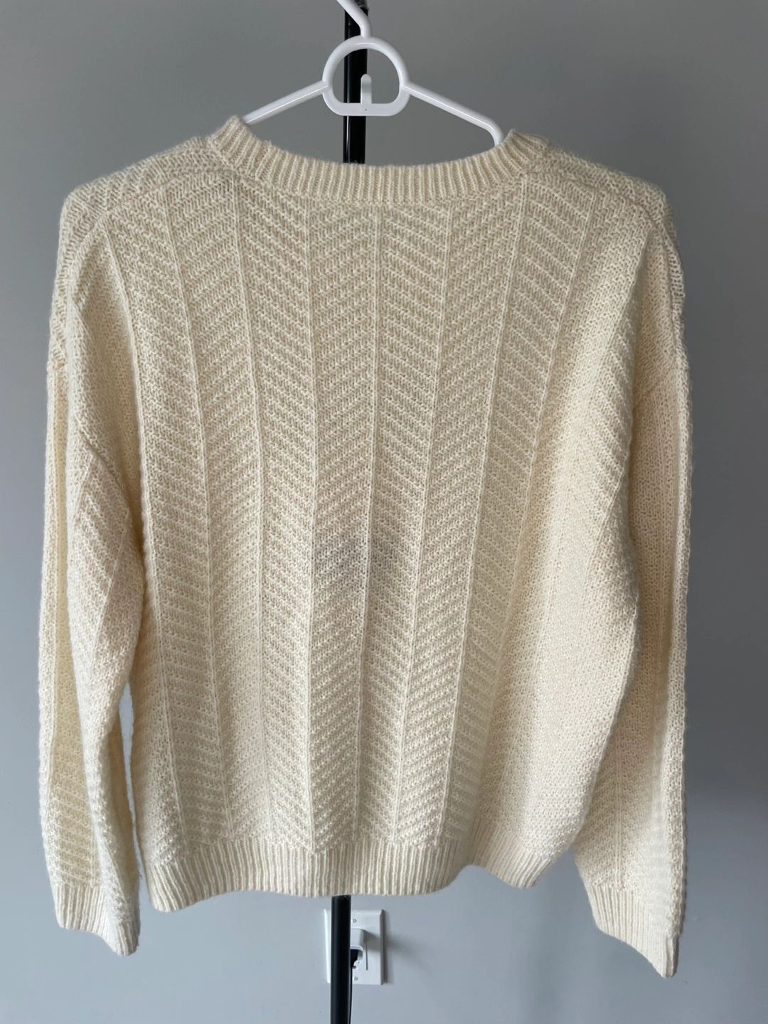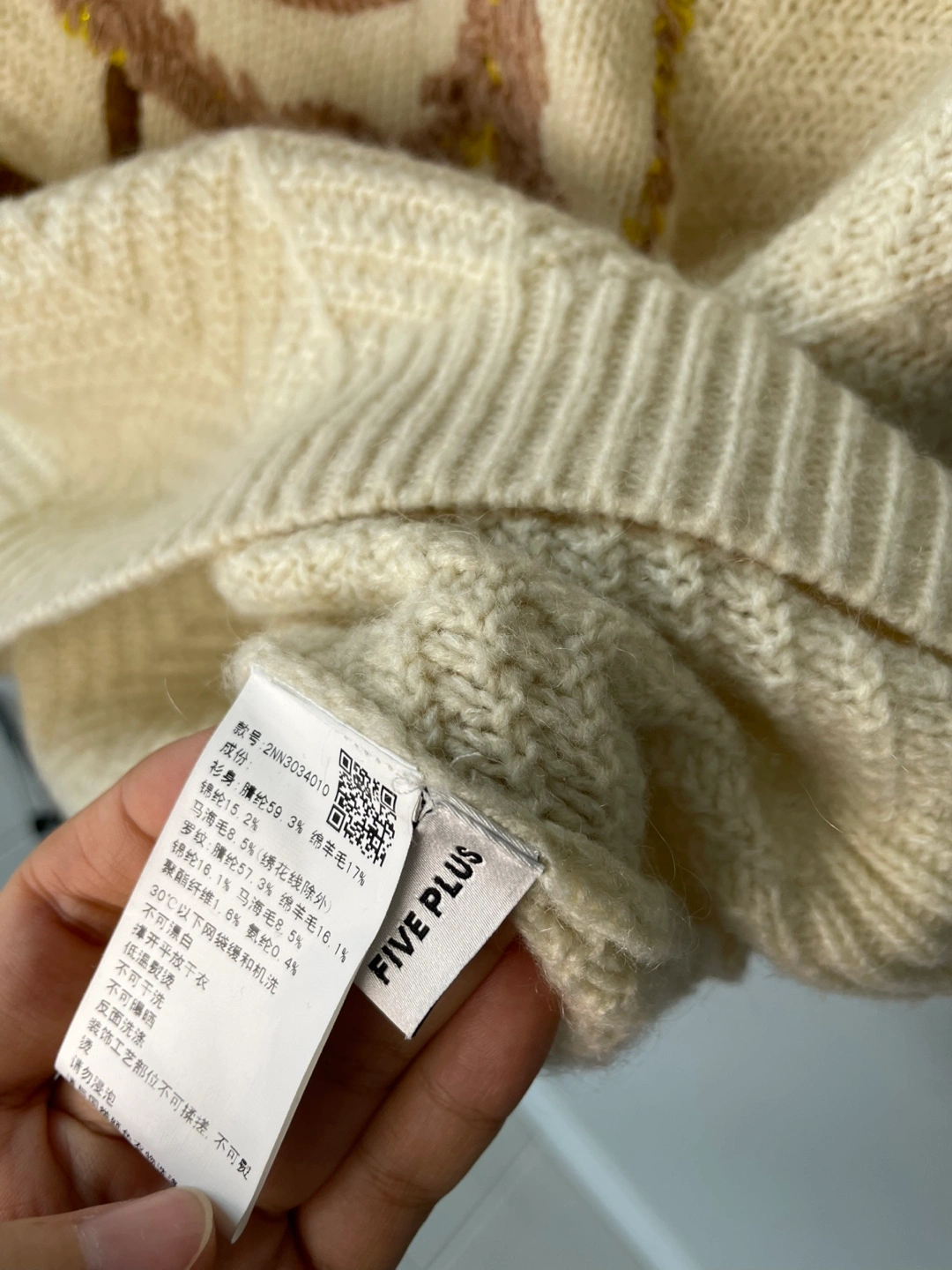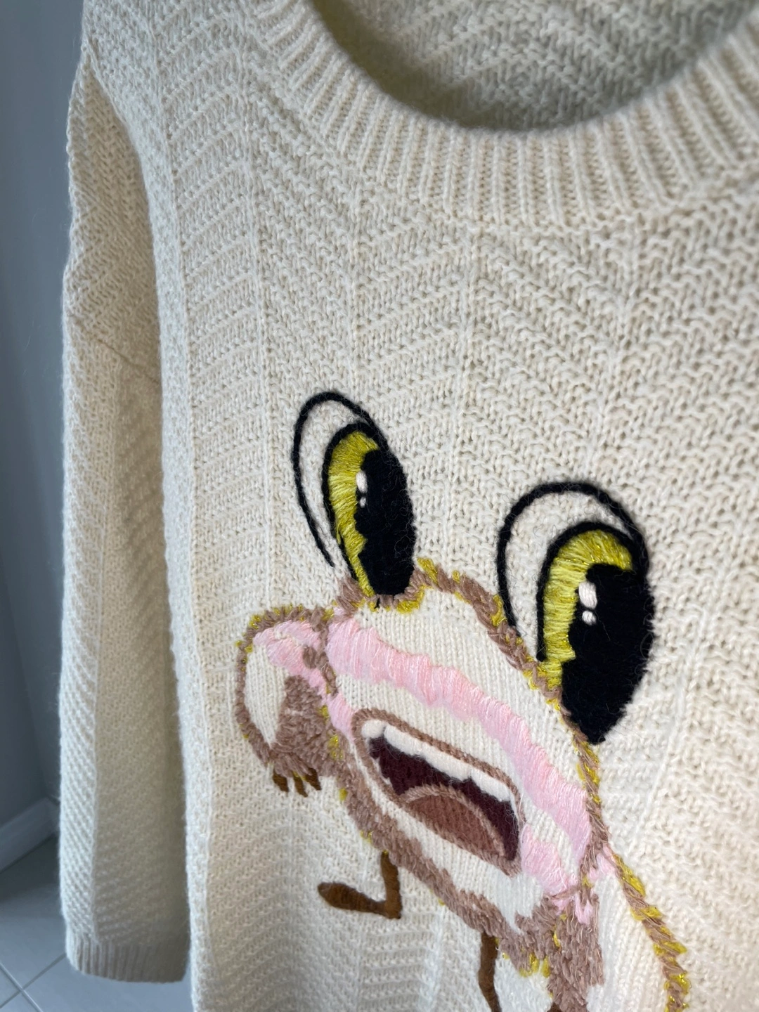 A cream-coloured knit sweater from FIVE PLUS featuring a fun embroidered monster graphic. It's made with a blend of polyester, acrylic, and spandex for comfort and stretch. Perfect for adding a playful touch to your outfit!