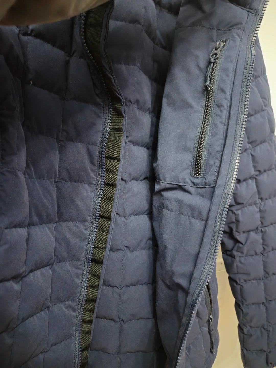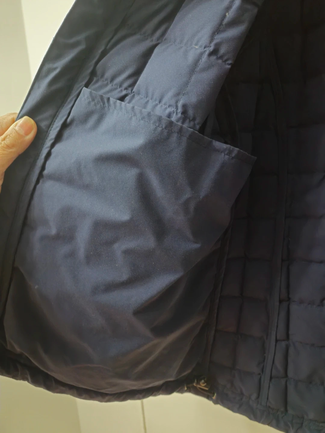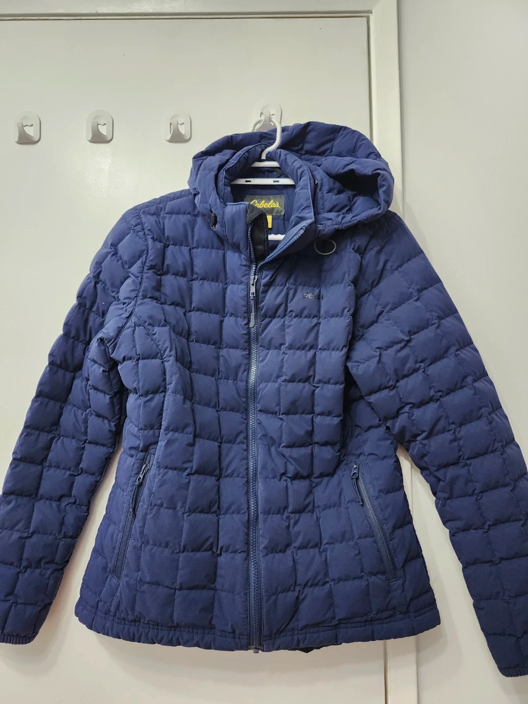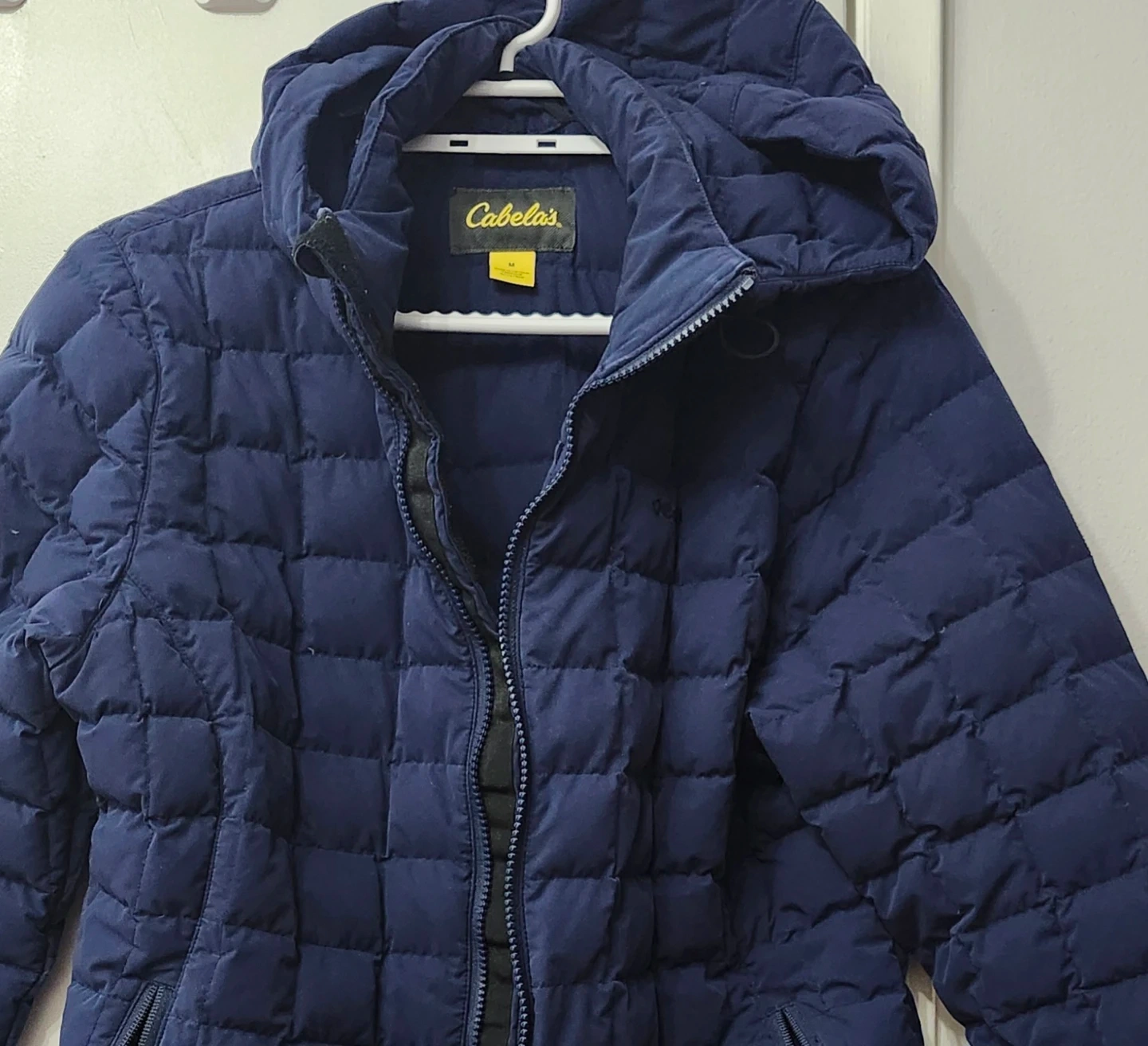 Navy blue quilted puffer jacket with a hood, made by Cabela’s. it’s solid blue with a zip front, zippered pockets, and a “Cabela’s” label inside.
