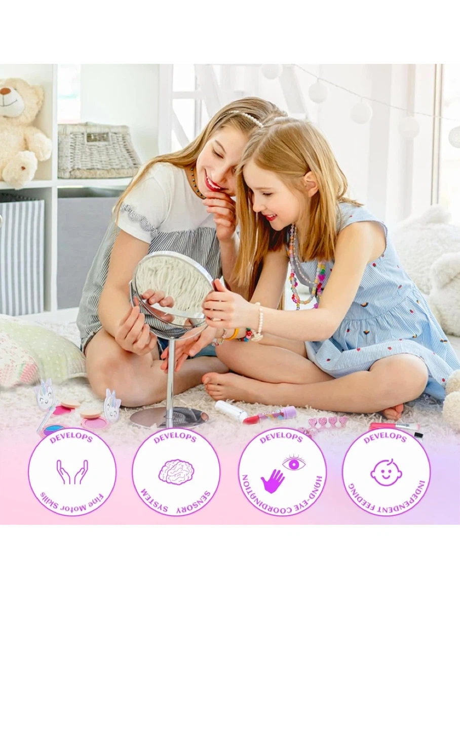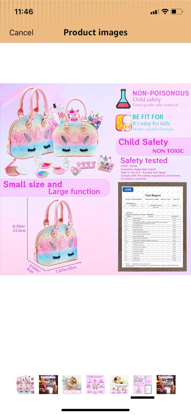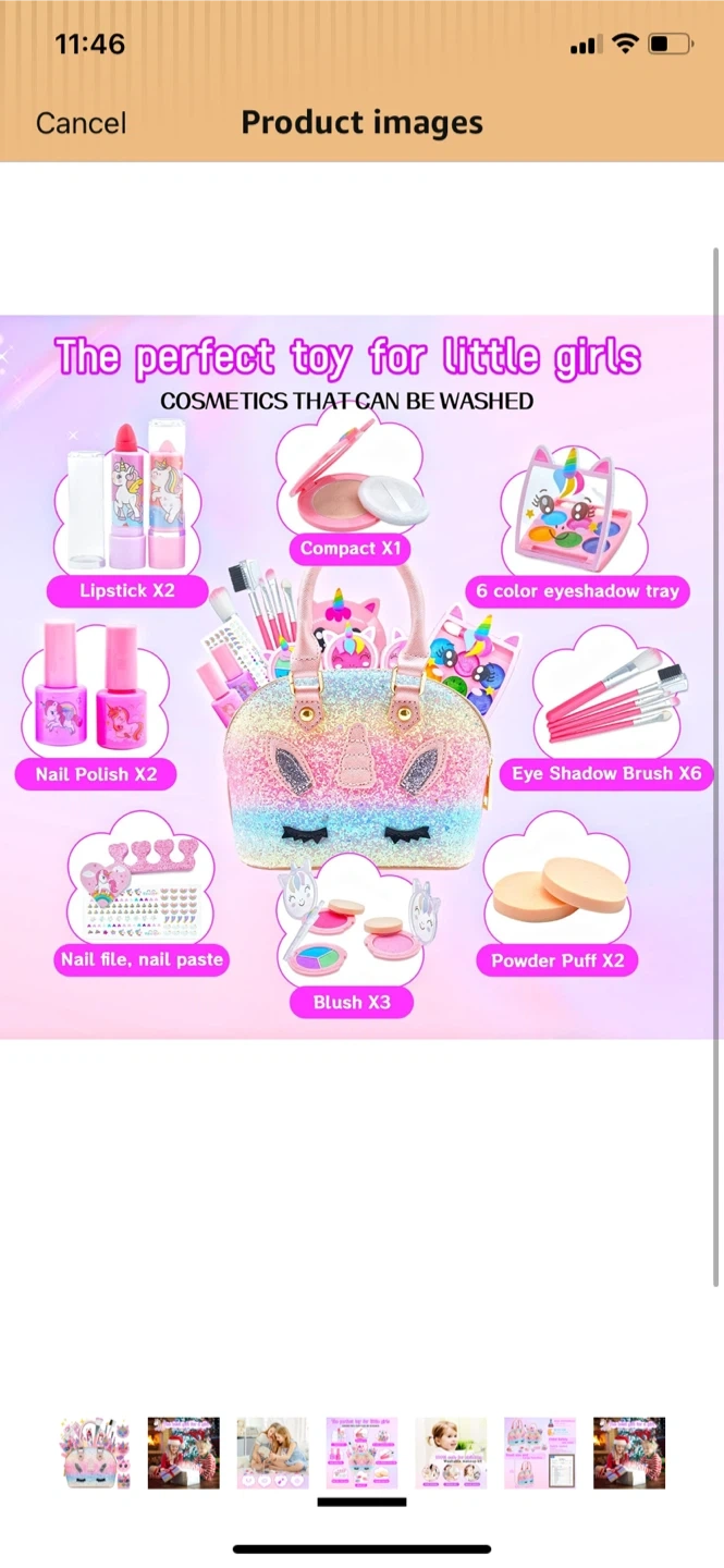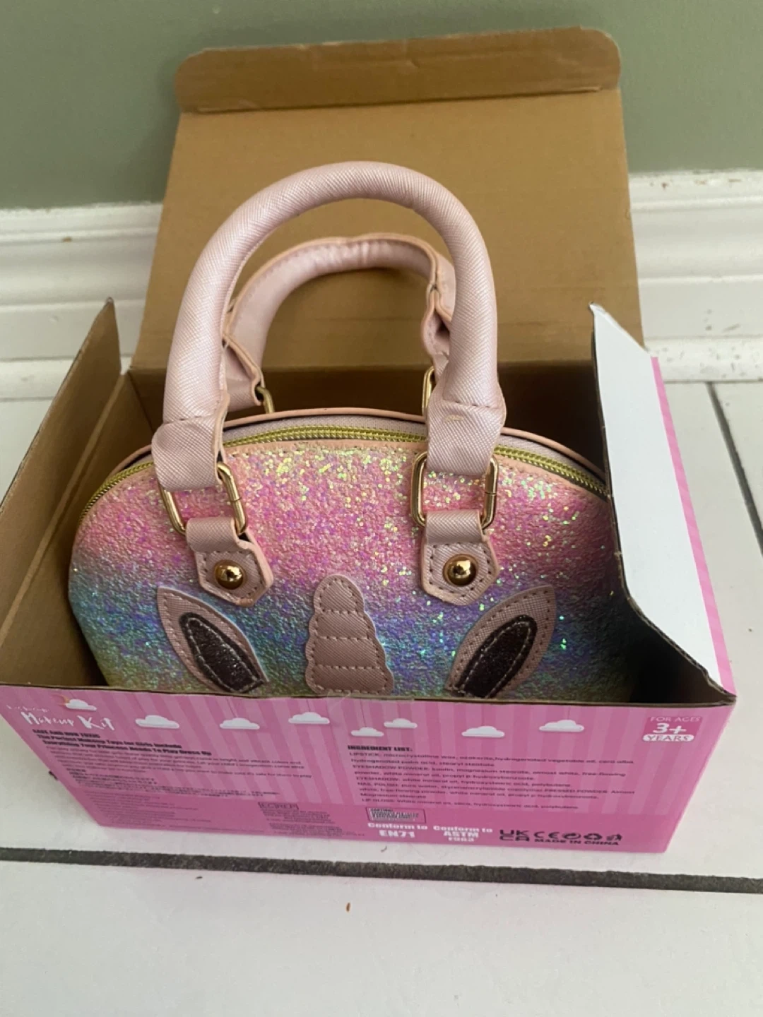 This kids washable makeup kit comes with a sparkly unicorn handbag. It's designed for children aged 3 and up. The makeup is water-soluble and non-toxic, ensuring safe play.