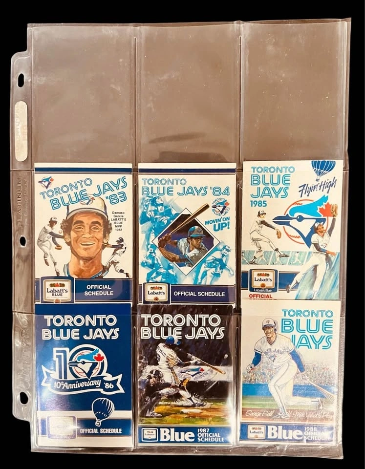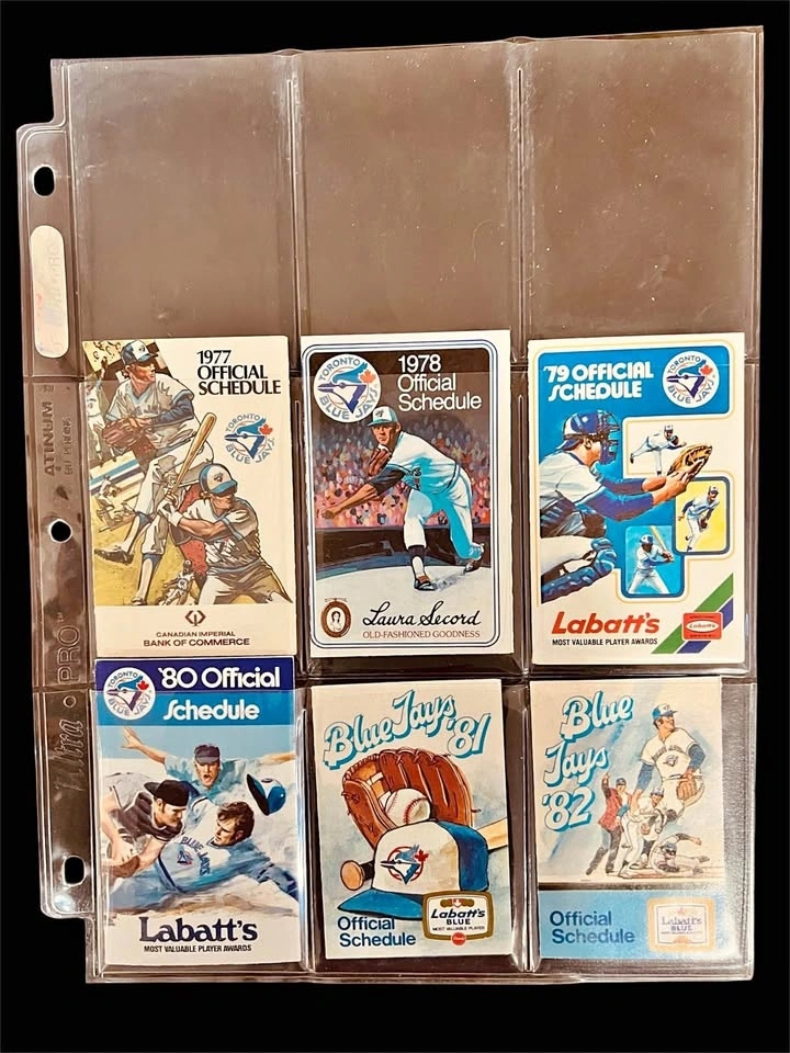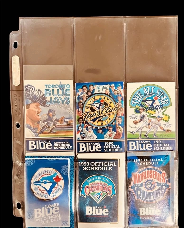 Complete set of 44 Blue Jays pocket schedules from 1977 to 2020. Includes the hard-to-find 2020 schedule. These capture key moments in Jays history like the '77 first game, '92 & '93 World Series, and anniversaries. All are in very good condition and stored in Ultra Pro sheets for protection. Pick up in Burlington.