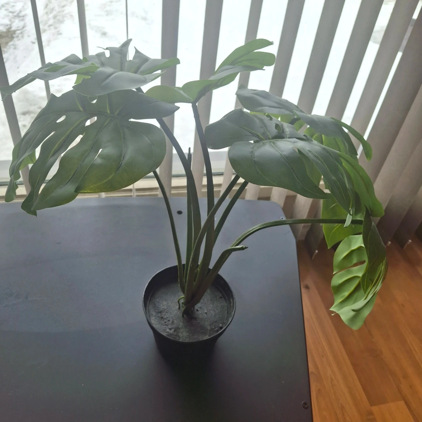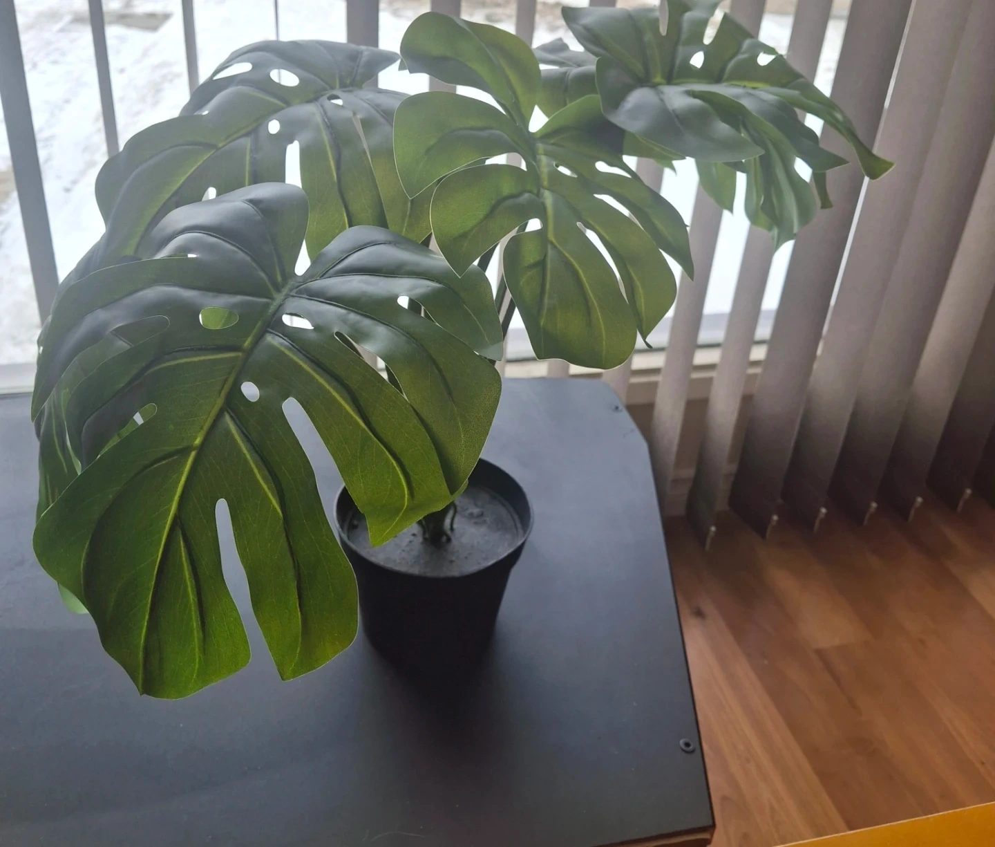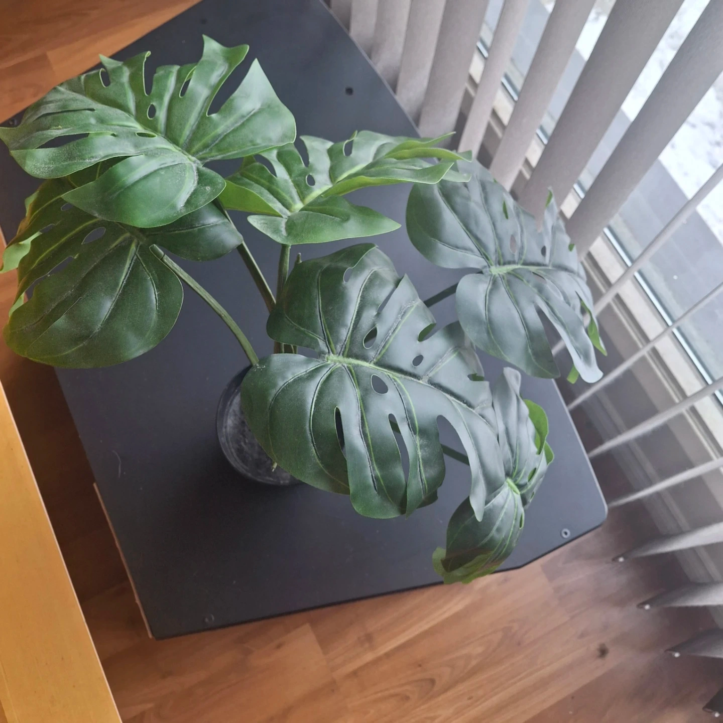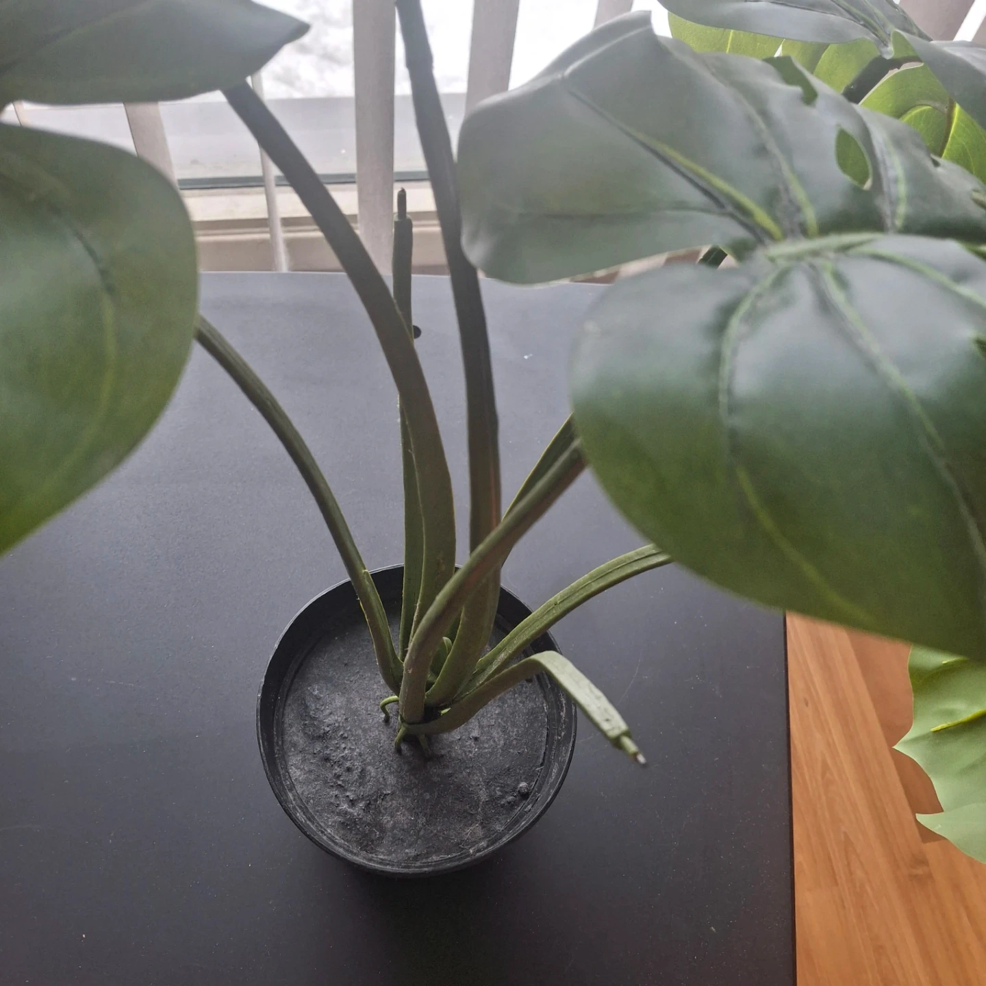 Realistic-looking artificial monstera plant in a black pot