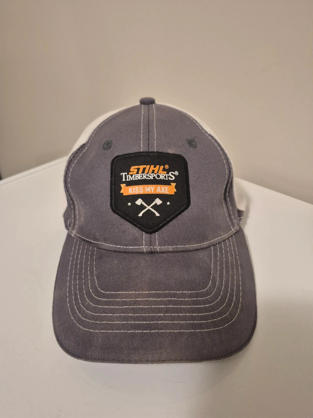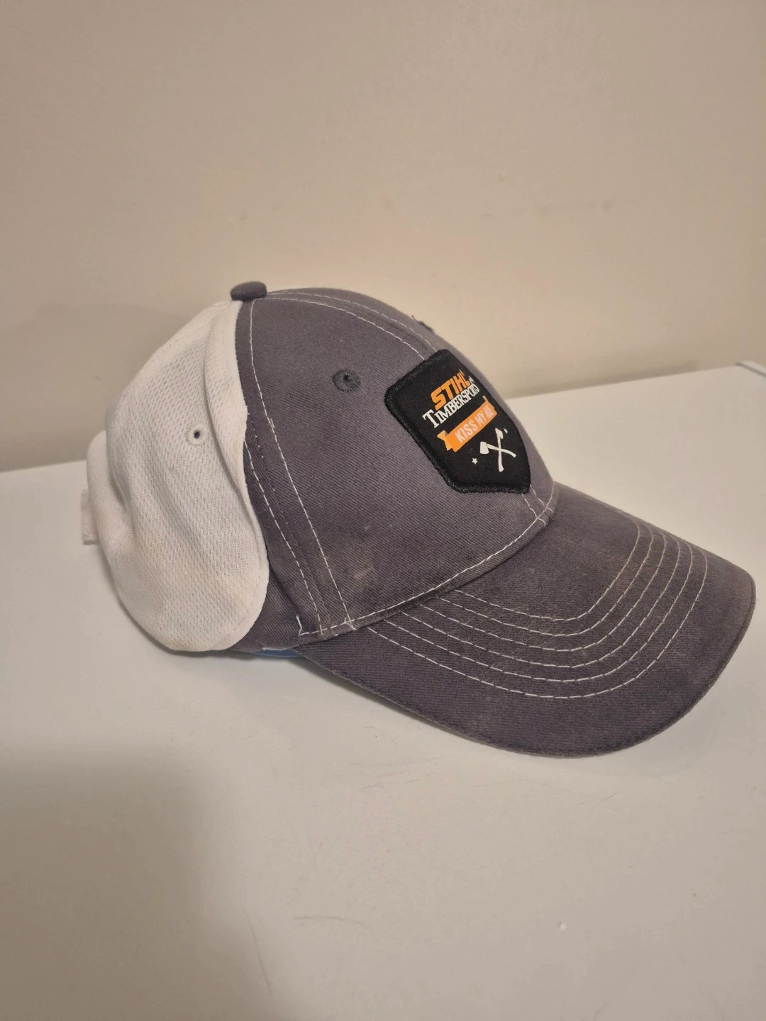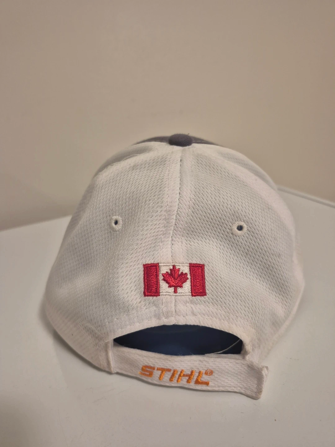 Grey and white baseball cap with Stihl Timbersports logo on the front and a Canadian flag on the back. Mesh back for breathability. Adjustable strap.