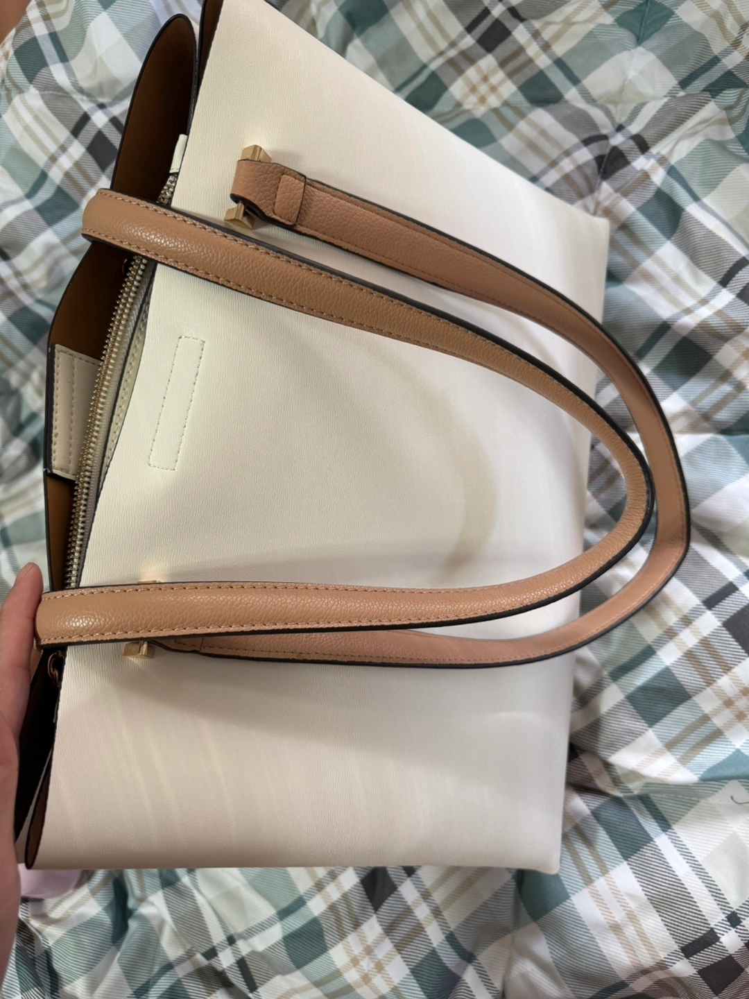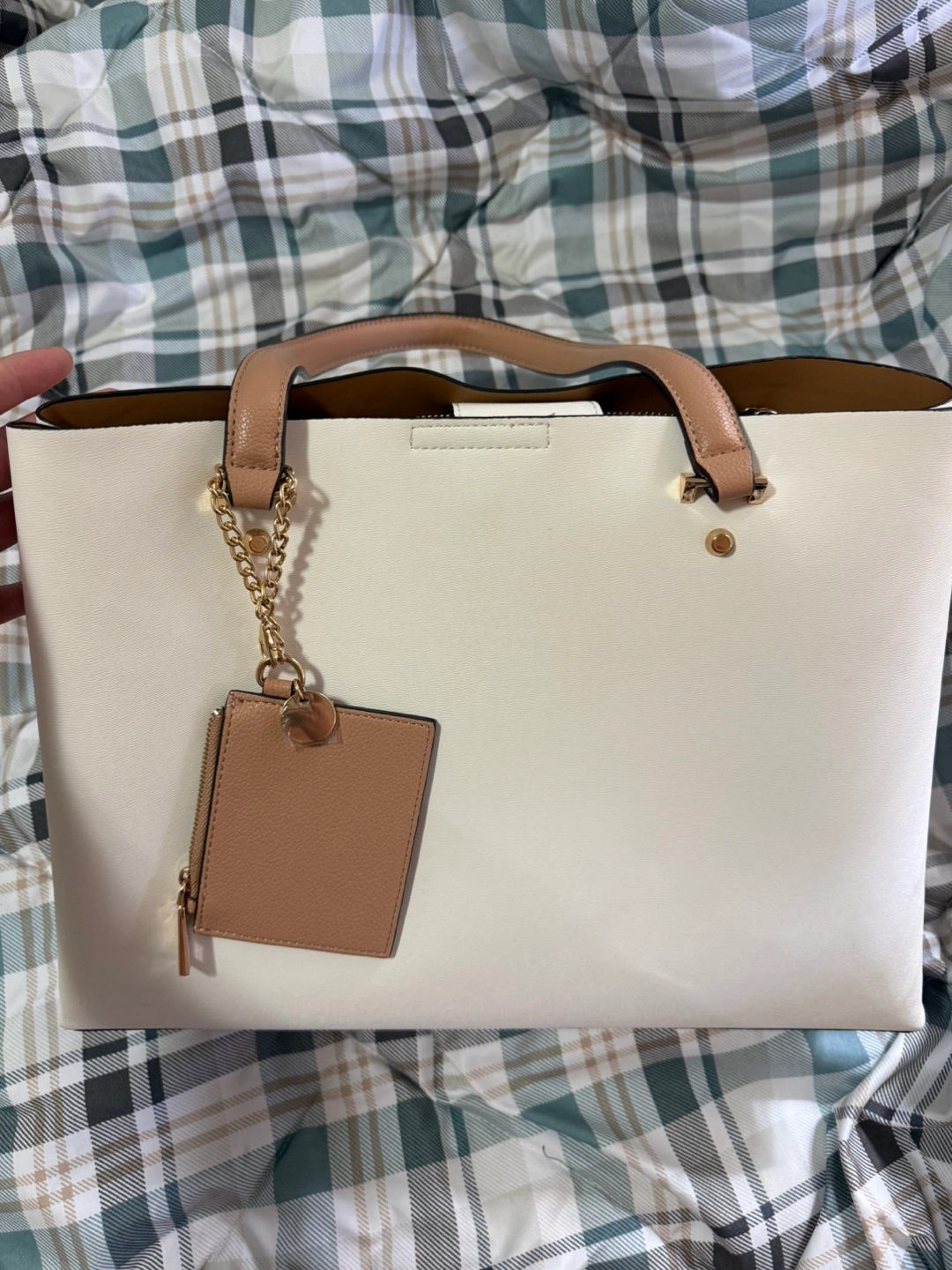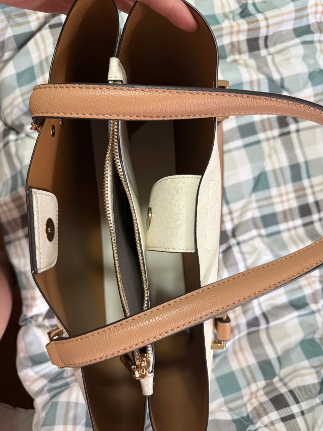 A stylish tote bag featuring a clean, two-tone design with brown handles and a beige body. It looks to be in great condition with a spacious interior. Perfect for everyday use!