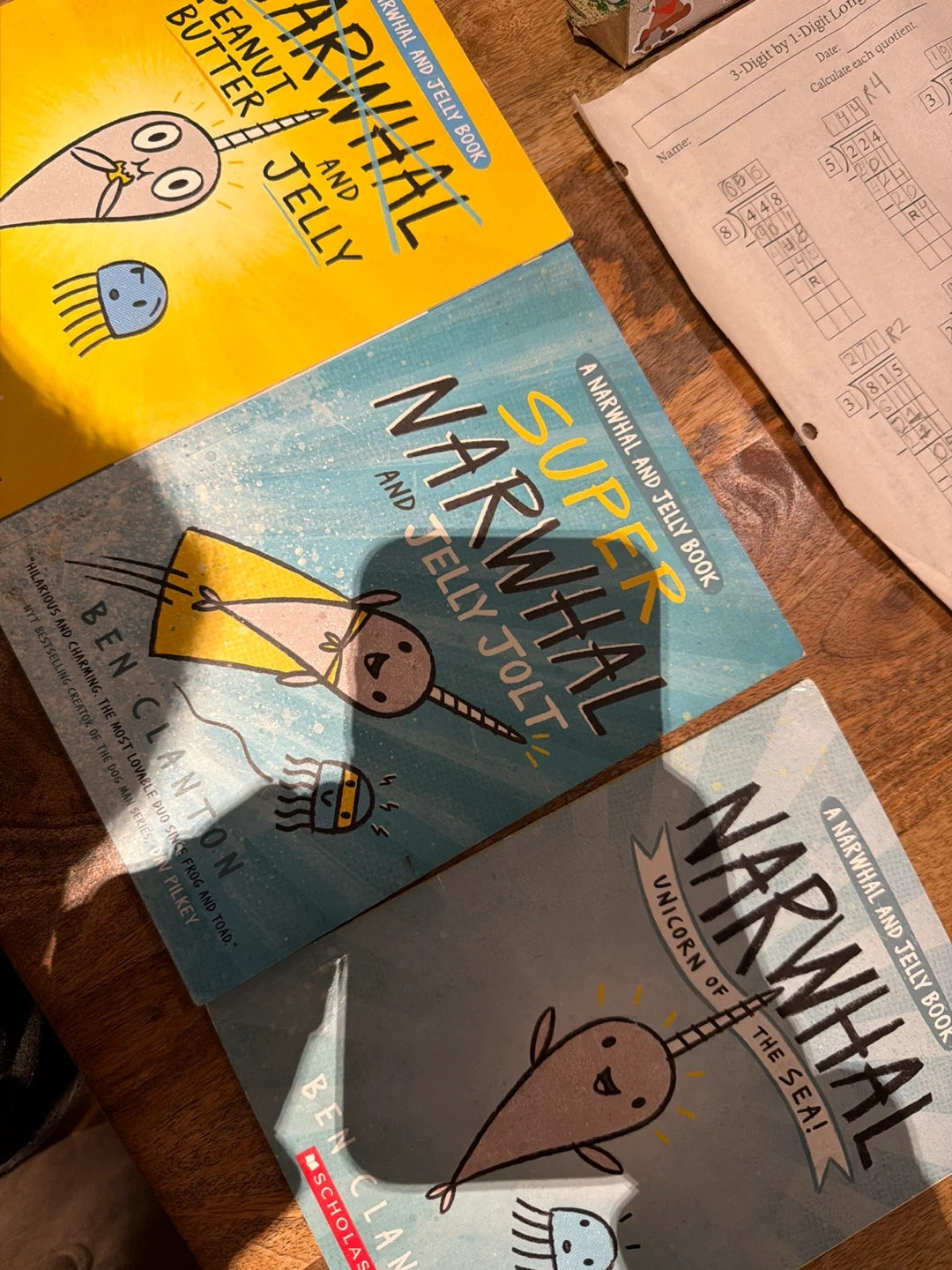 This is a set of three "Narwhal and Jelly" books by author Ben Clanton. The titles included are "Narwhal and Jelly", "Super Narwhal and Jelly Jolt", and "Narwhal: Unicorn of the Sea!". These are Scholastic books.
