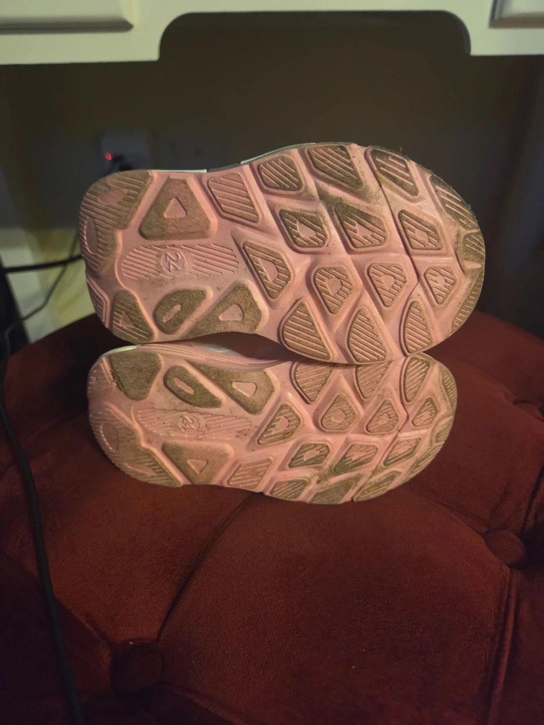 These cute pink and white sneakers feature a Disney Frozen theme with Elsa on the sides. They have a dial closure for easy tightening. The soles show a size 22 indication, suggesting a small children's size. Perfect for any little Frozen fan!