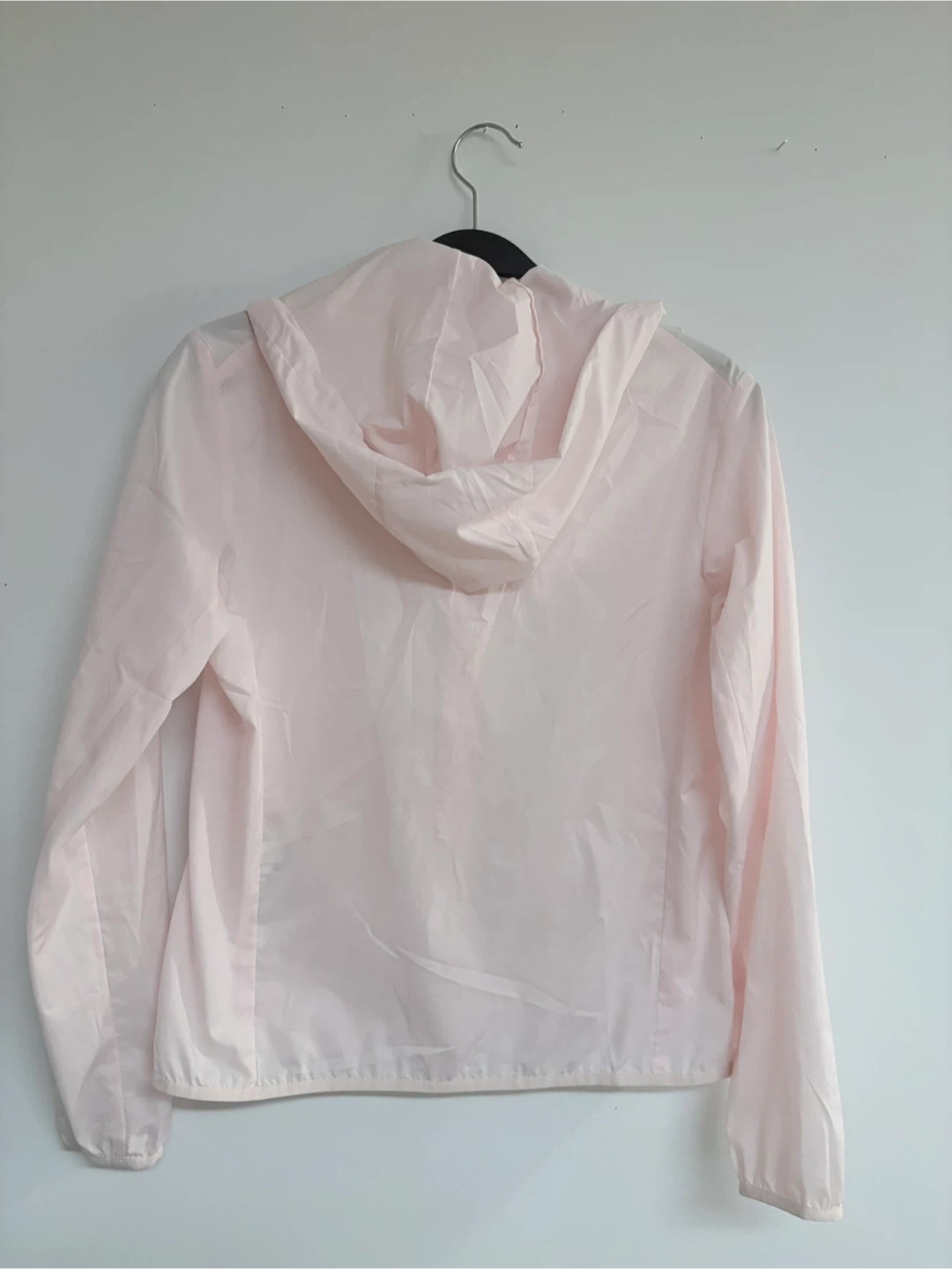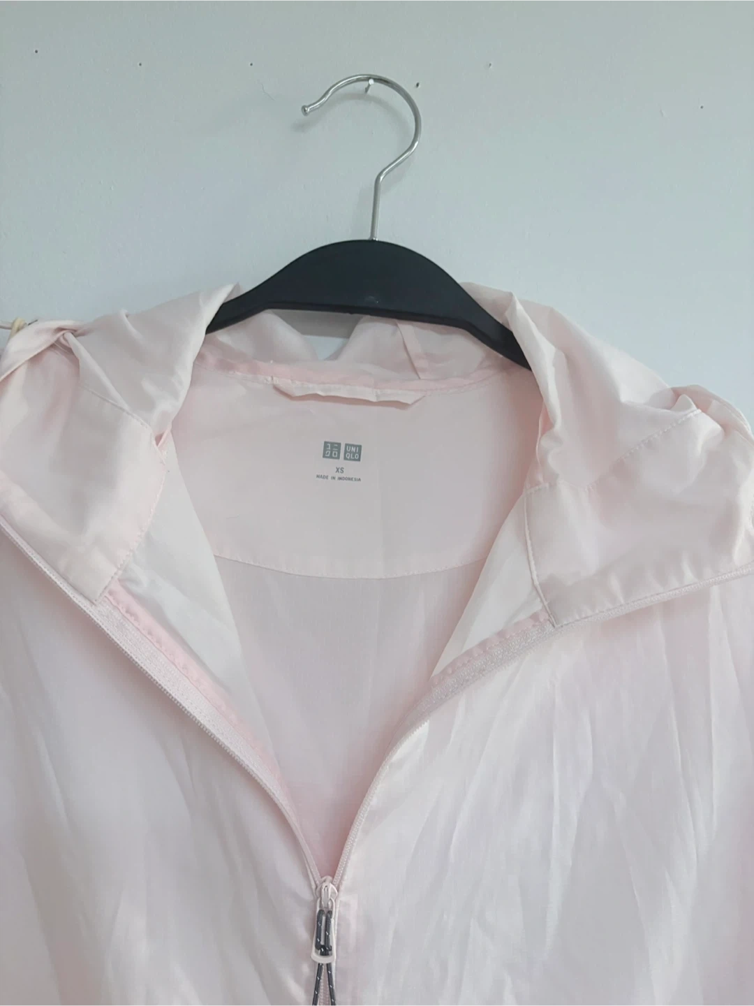 This is a UNIQLO lightweight hooded jacket in a pale pink colour.