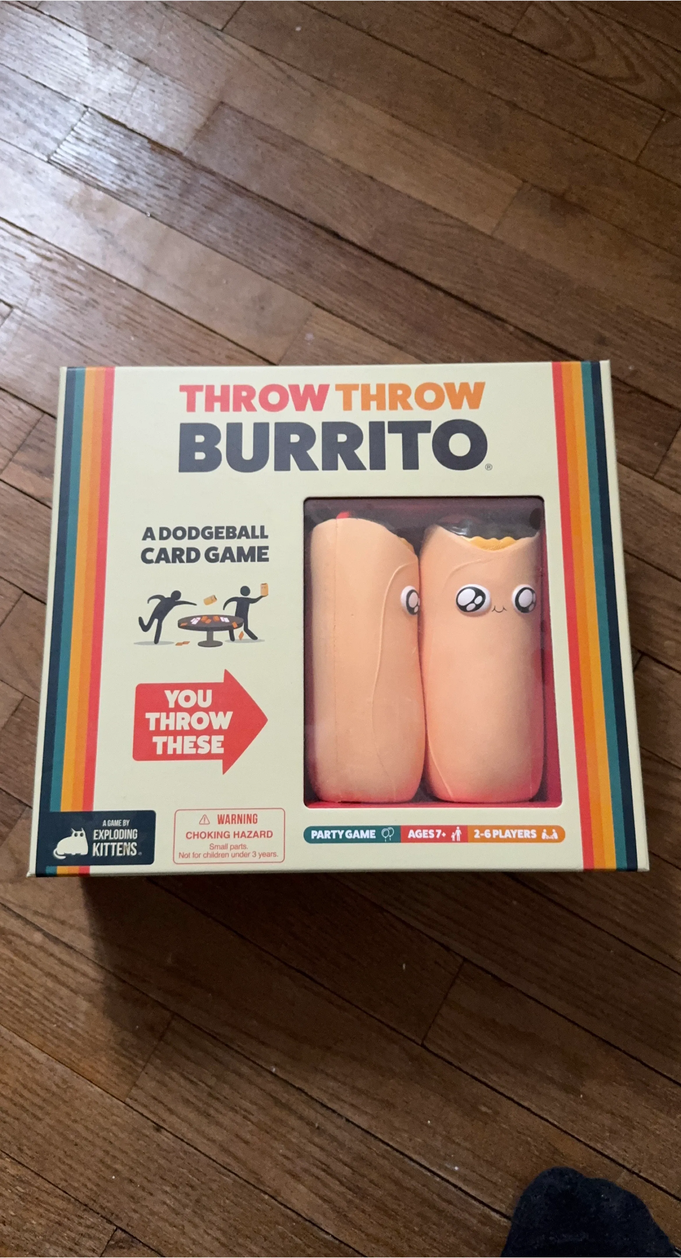 Brand new, sealed cards. “Throw Burrito card game, a hilarious dodgeball card game. It's made by Exploding Kittens. Suitable for ages 7 and up, it's great for parties and family game nights!”