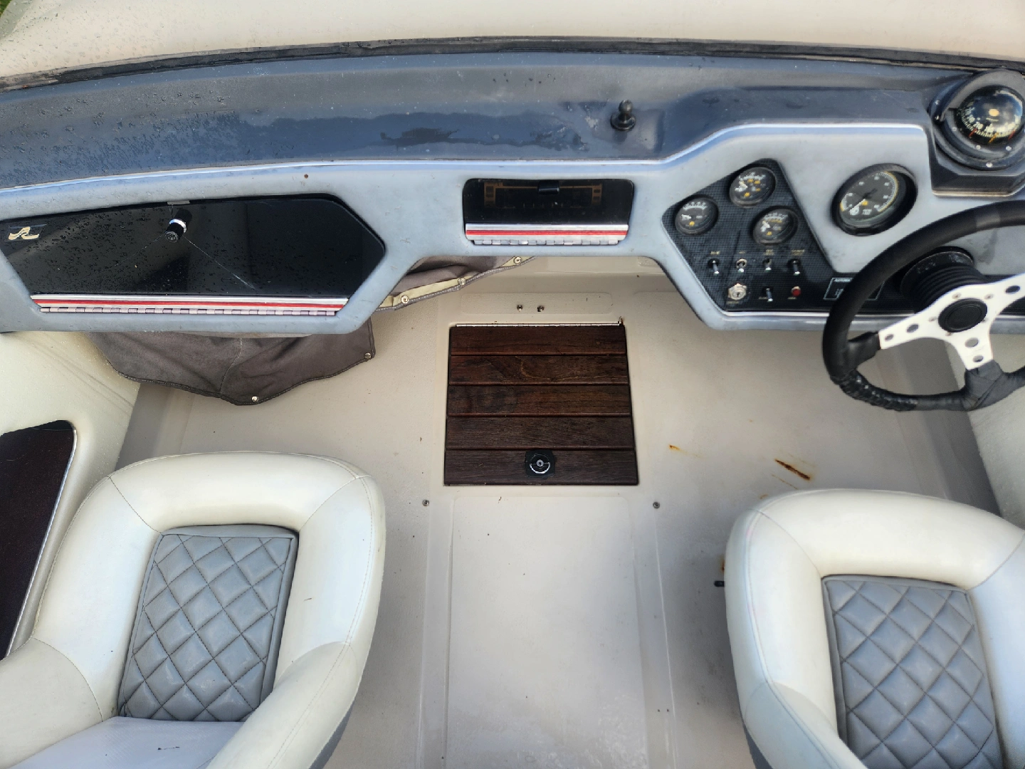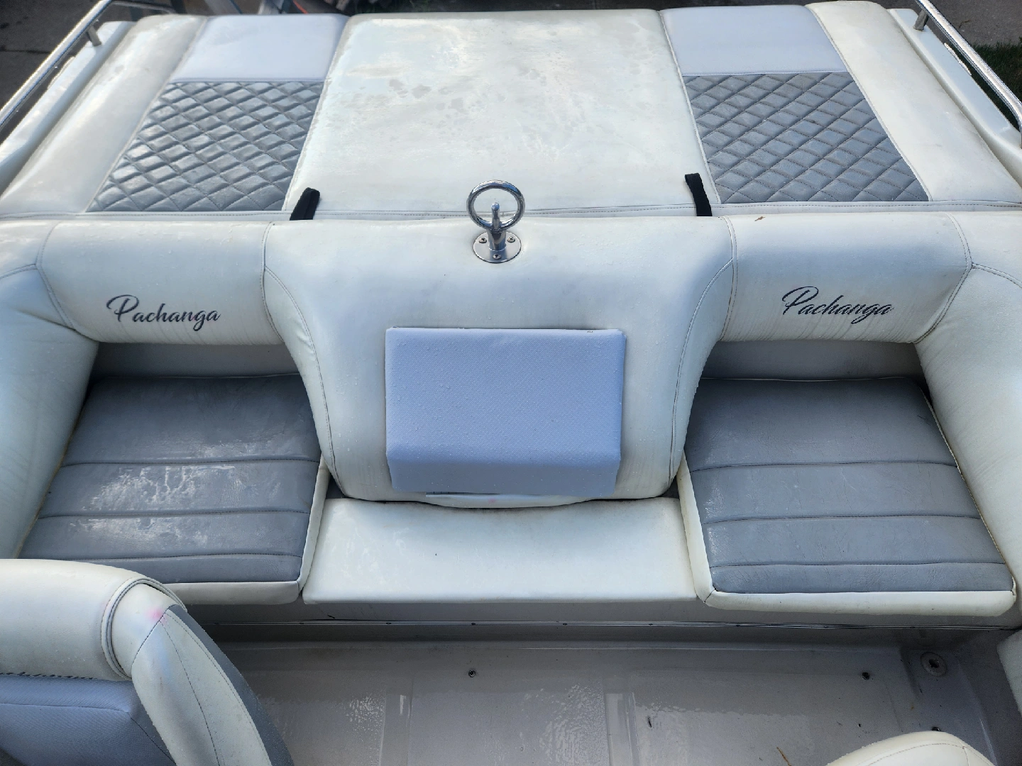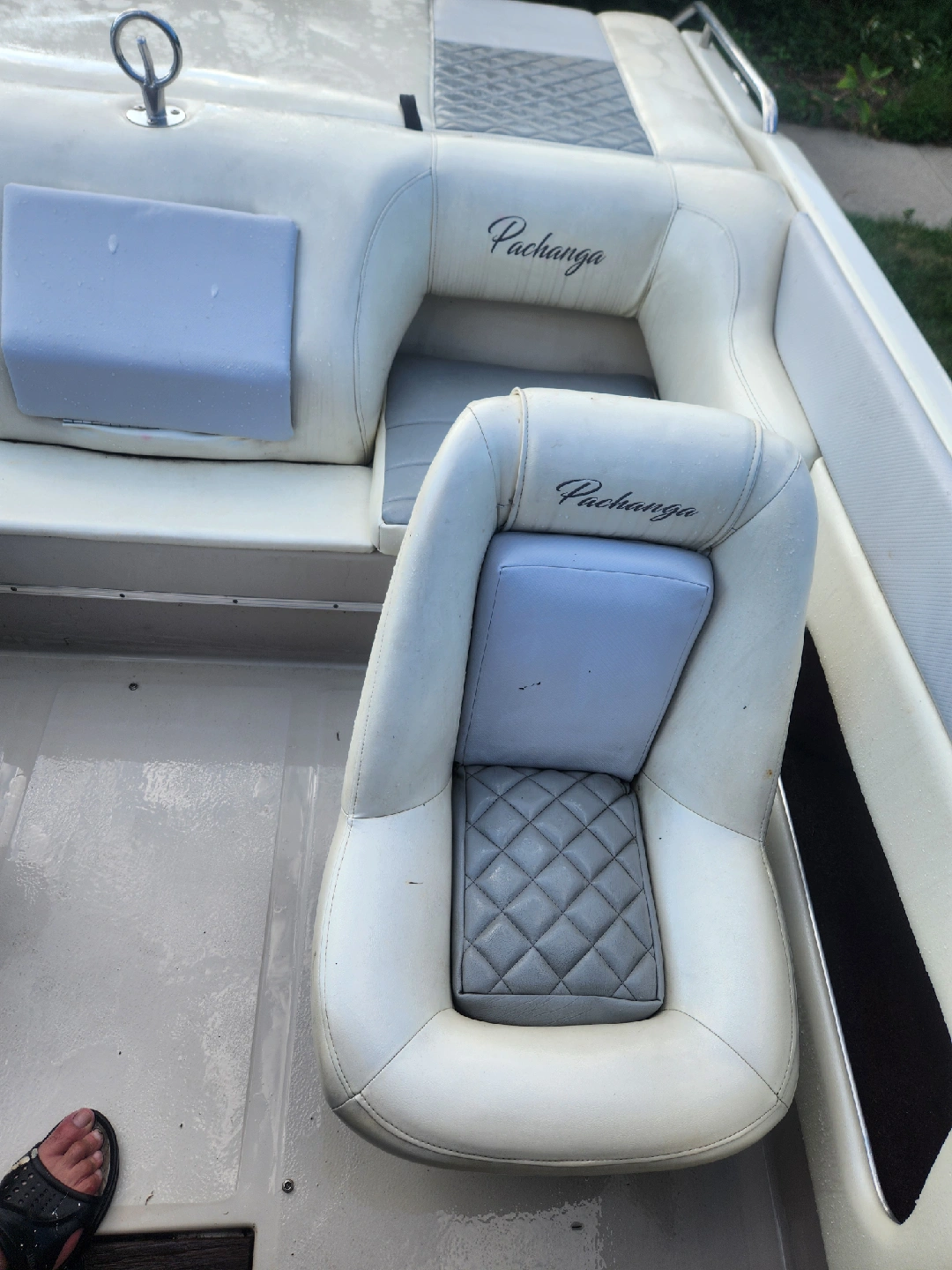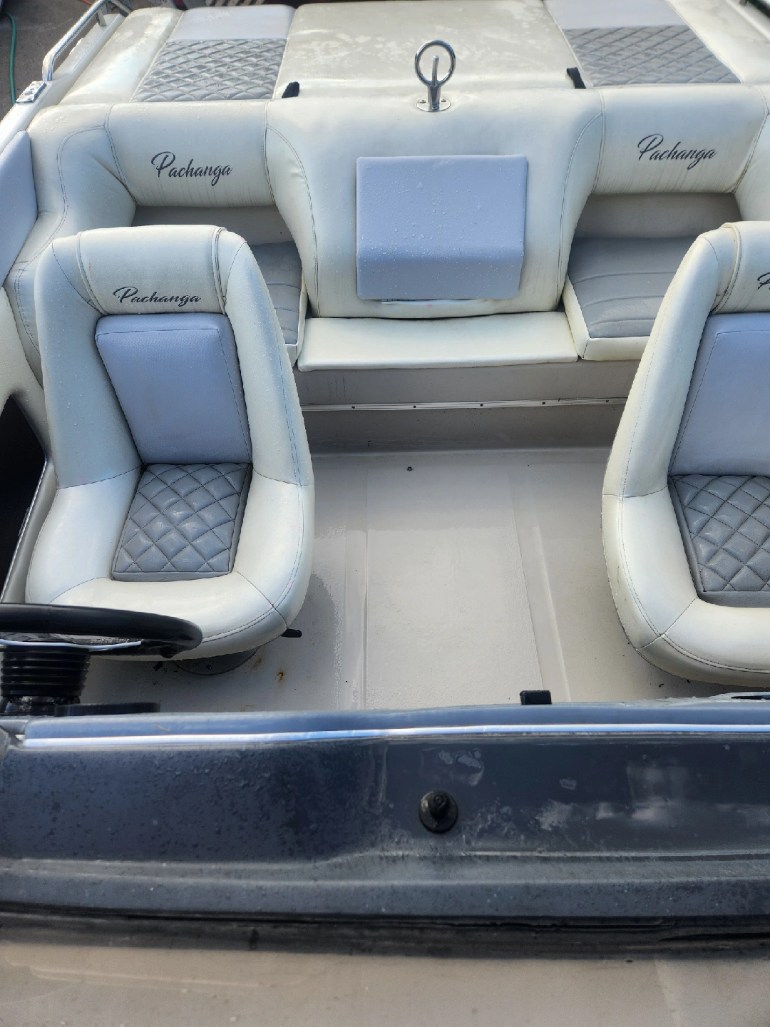 Selling a Pachanga boat. It has white and grey leather seats with a quilted design. The interior is in good condition.