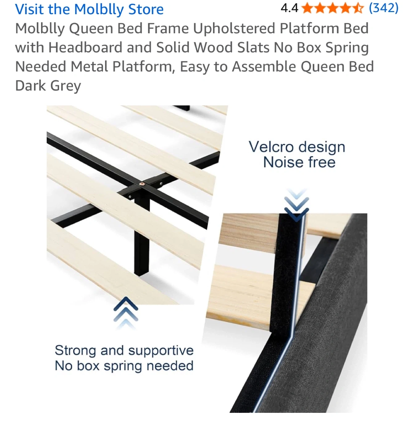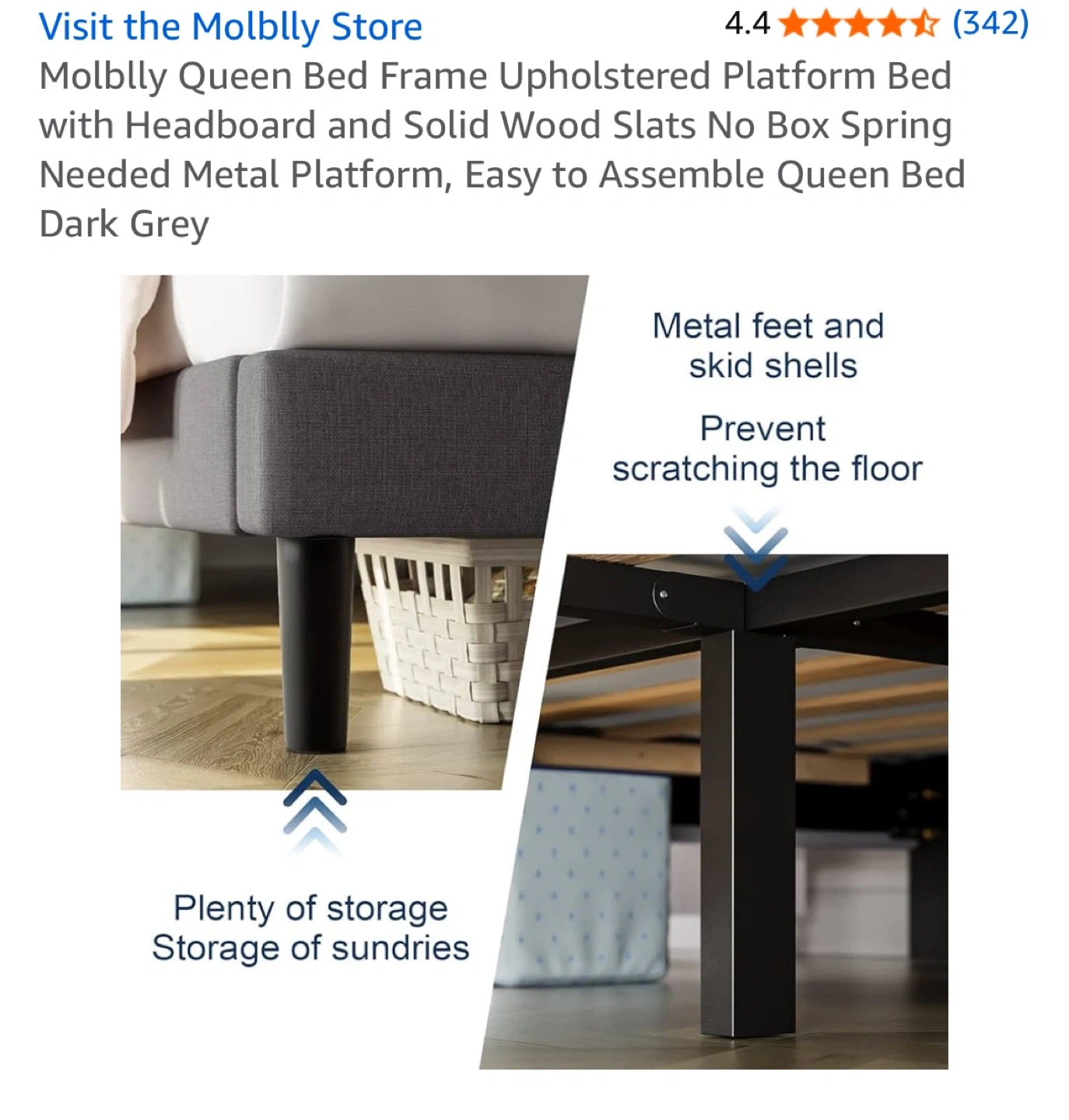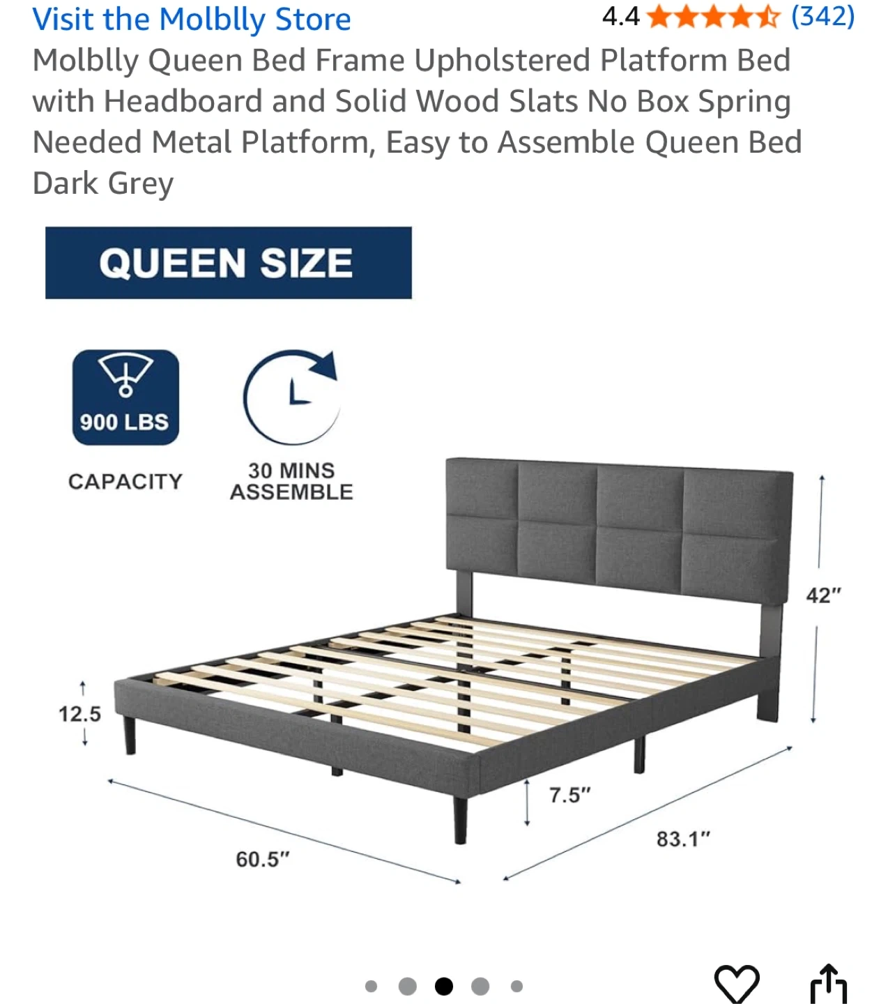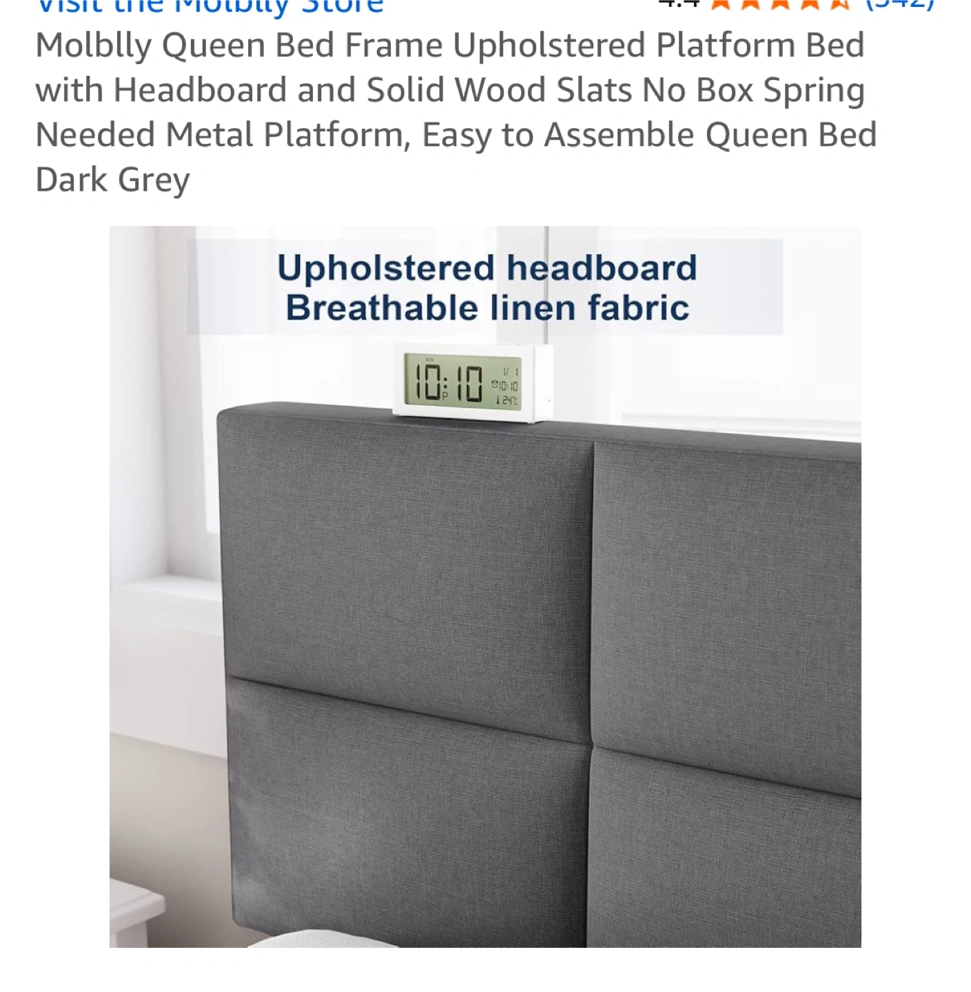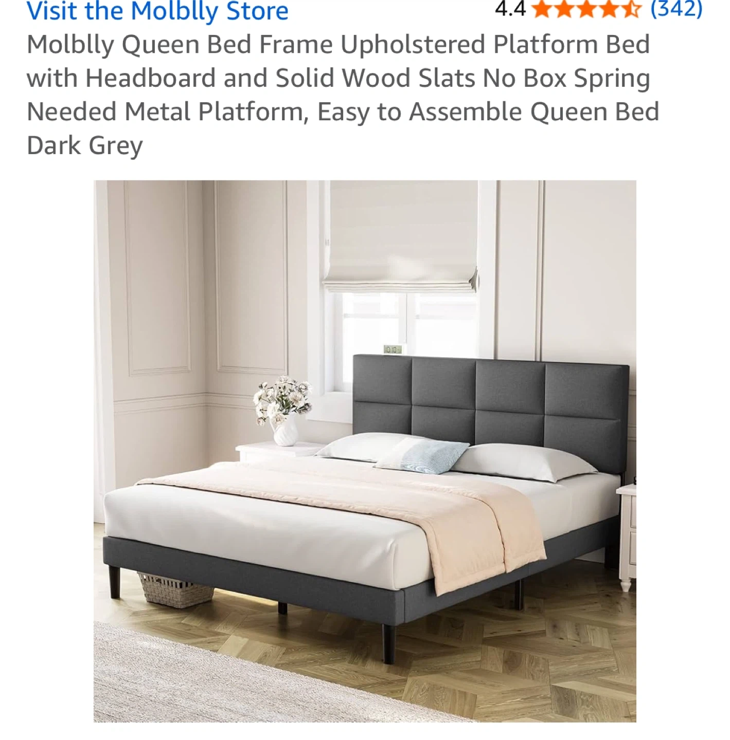 Looking to upgrade your bedroom? I'm selling a Queen Bed Frame in dark grey. It is kept packed ever since it arrived from amazon. It features an upholstered platform bed with a headboard and solid wood slats. No box spring is needed! It's easy to assemble and has a metal platform. The headboard is made of breathable linen fabric. It also has metal feet with skid shells to prevent scratching the floor. It can hold up to 900 lbs