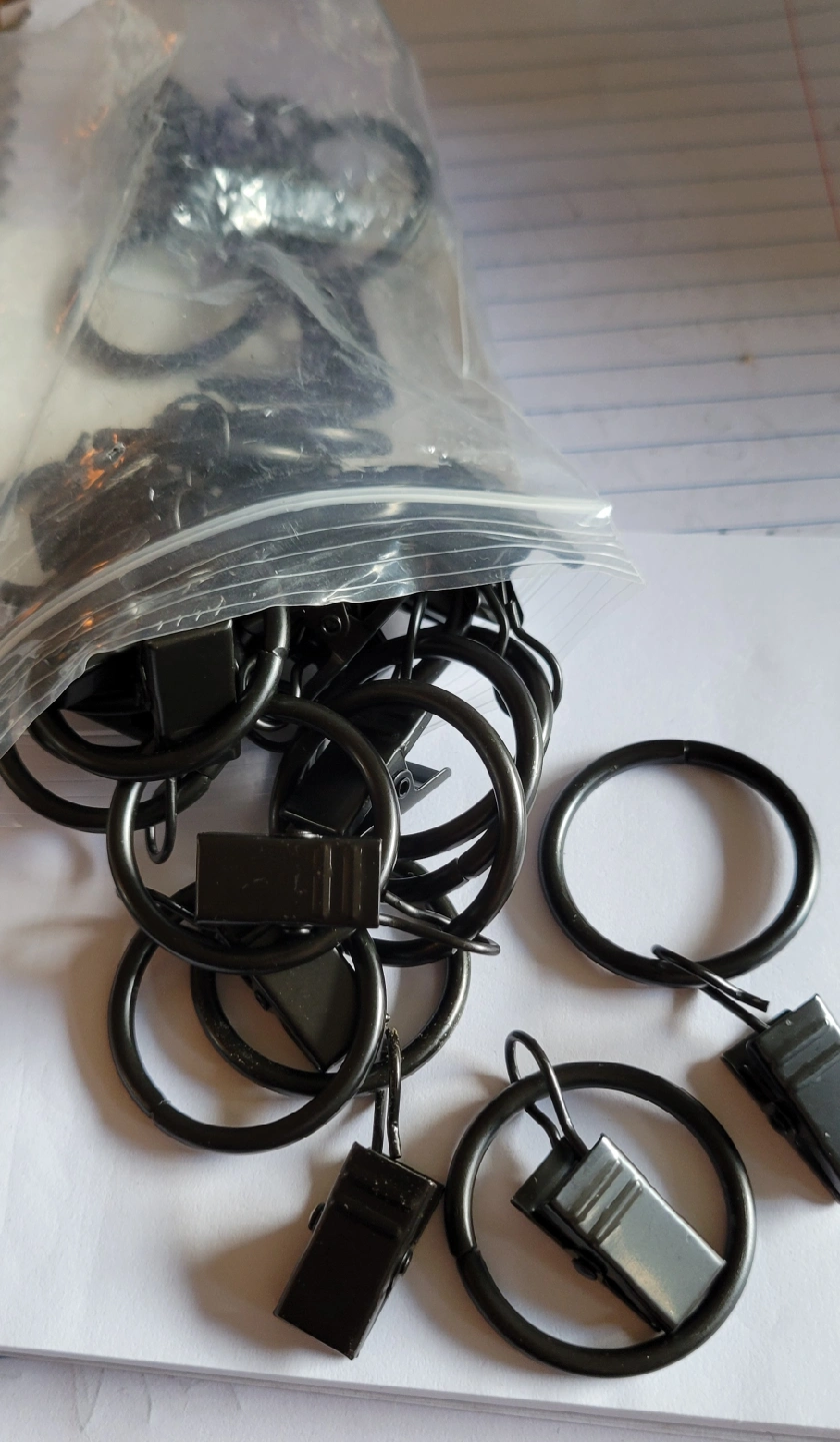 20I have bought the wrong size, these are new and unused curtain rings. The pack holds 20 rings. They are enamelled black. I have reduced the price I paid slightly.