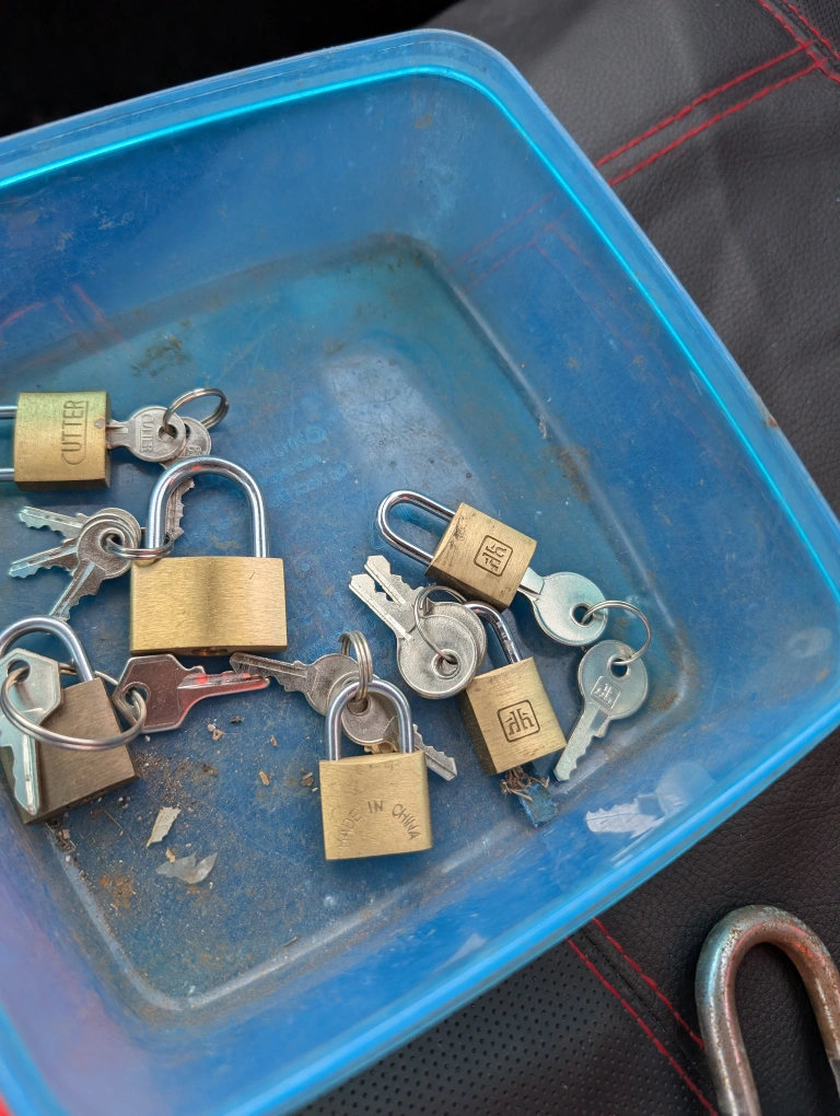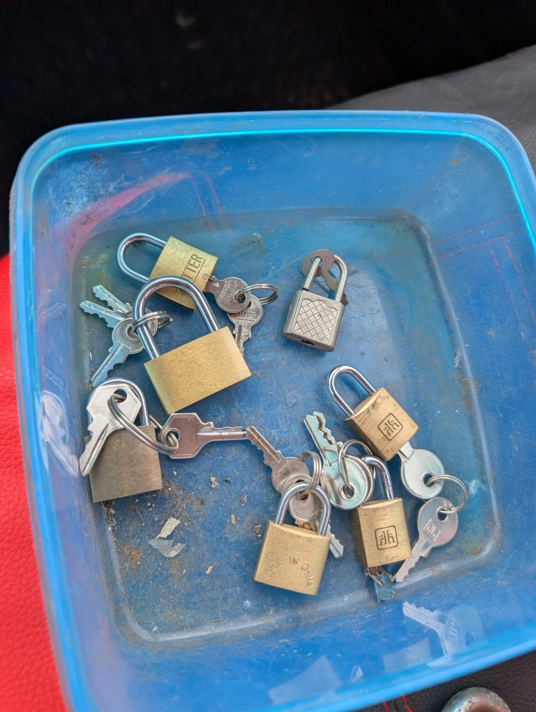 A collection of padlocks and keys, perfect for securing your belongings. Various sizes and styles are included, ready for a new home! small sizes