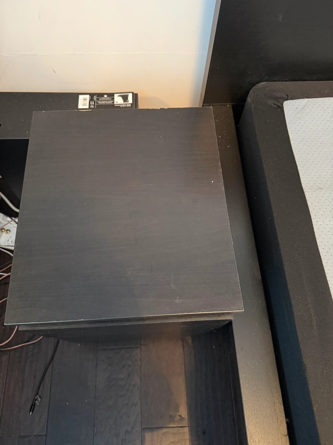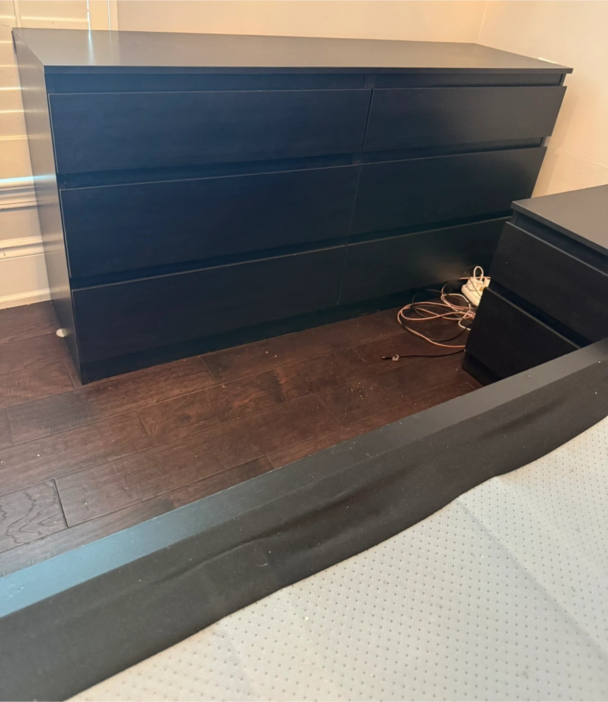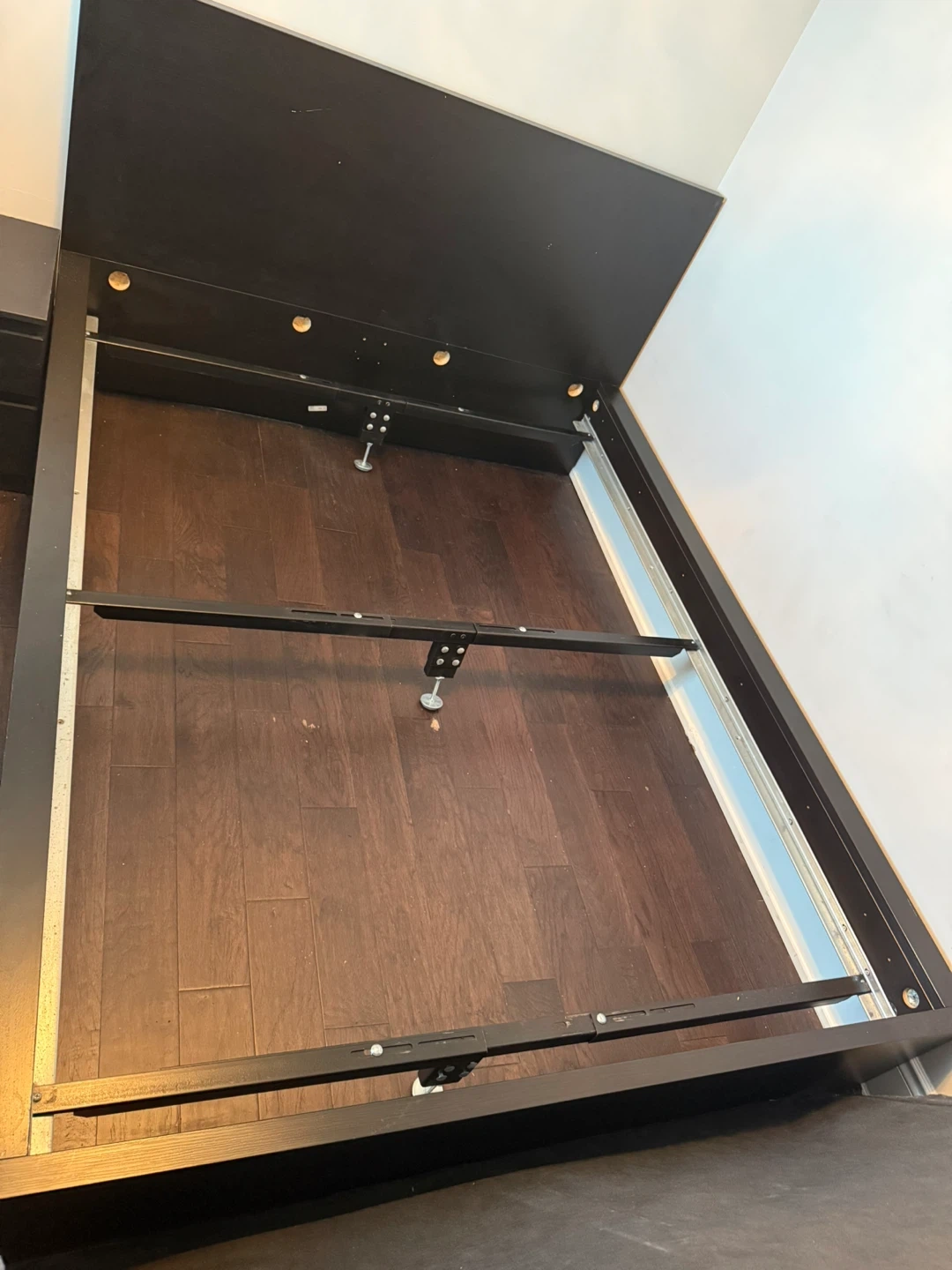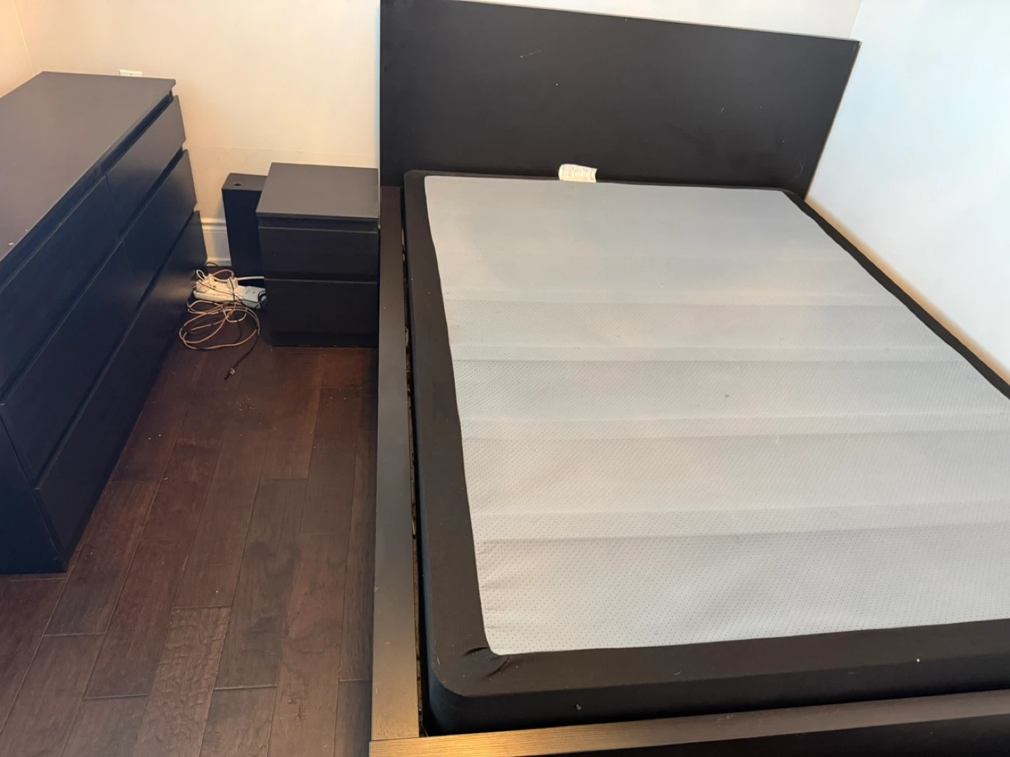 Black queen bed frame, includes one matching nightstand and a six-drawer dresser. All furniture is a dark wood finish. This set is perfect for a bedroom. Excluding the queen bed box. Pick up only please.