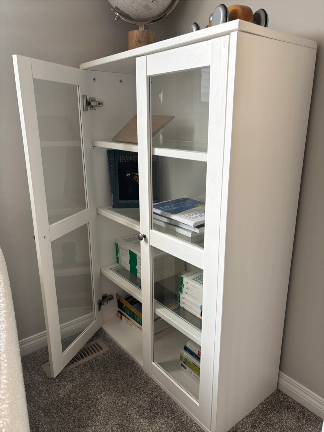 White display cabinet with two glass doors. It has three adjustable shelves inside. Perfect for storing books or decorative items!