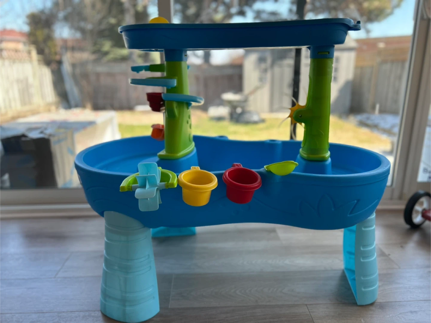 Fun Step2 water table for hours of outdoor play! It's made of durable plastic. This table's great for little ones on a warm day!