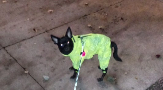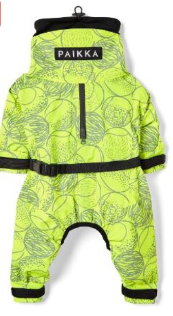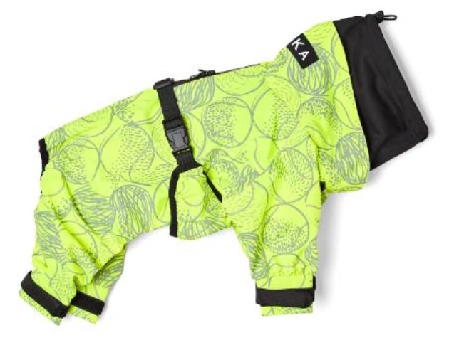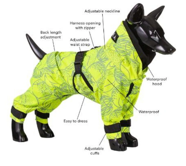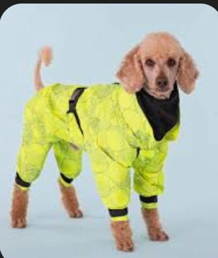 👍IF YOUR DOG HATES OR REFUSES TO WALK IN THE RAIN THIS IS YOUR SOLUTION!!! now that I have this my dog has no issues going for a walk in the rain.. I used to have to literally drag her. ... I put a photo of her wearing the same suit, but it's not the one I have posted.. the one posted here is one size up from the one shown on my dog (2nd pic) lets be honest in Van it's gonna rain at some point in all 12months ... from one dog owner to another, BEST DOG ITEM I EVER BOUGHT (if ur dog is the same as mine) Waterproof dog jumpsuit. Bright yellow with tennis ball pattern. Adjustable straps and cuffs. Features a harness opening and hood. size 35 (reg price $119)