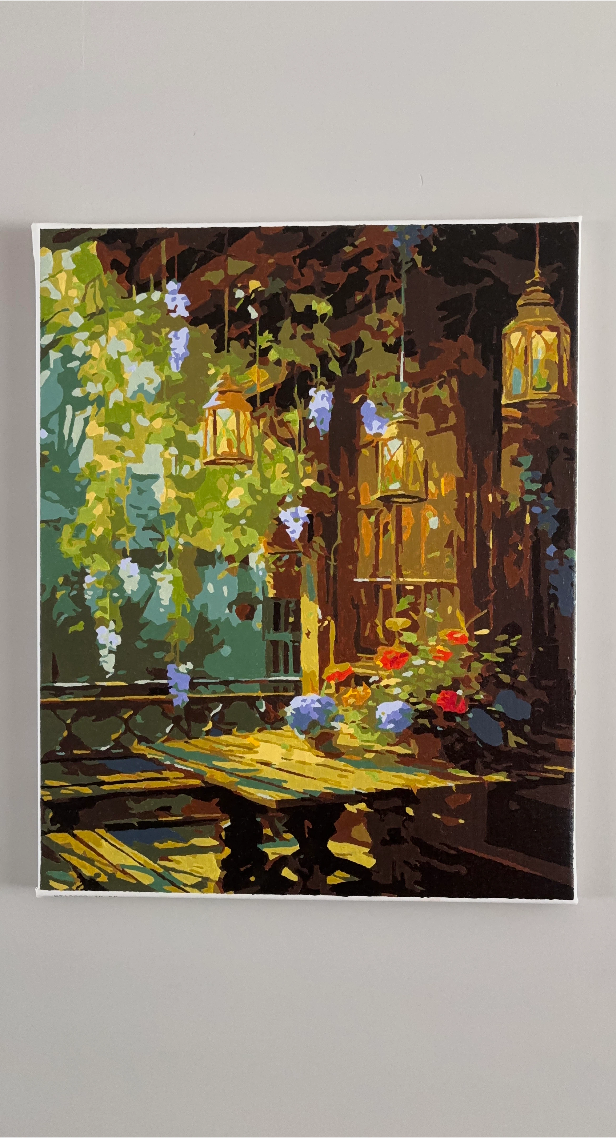 This is a painting on canvas depicting a scene with lanterns and flowers. It would be a great addition to any room!