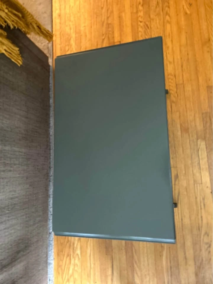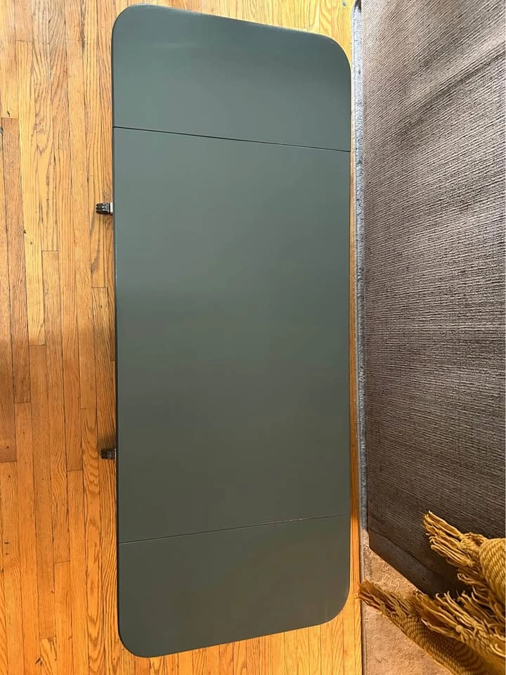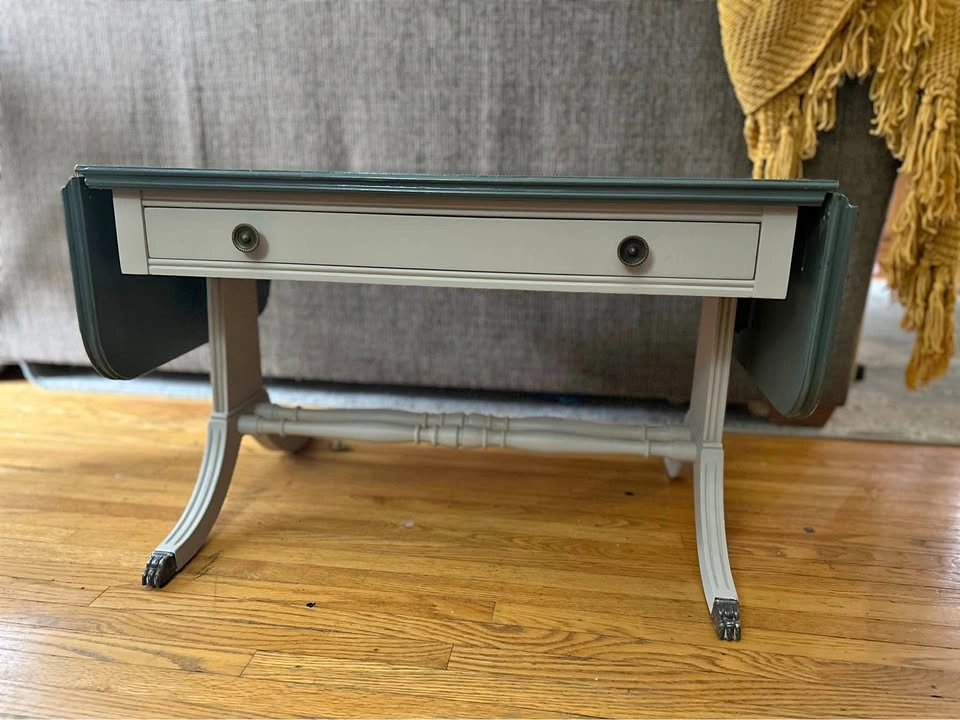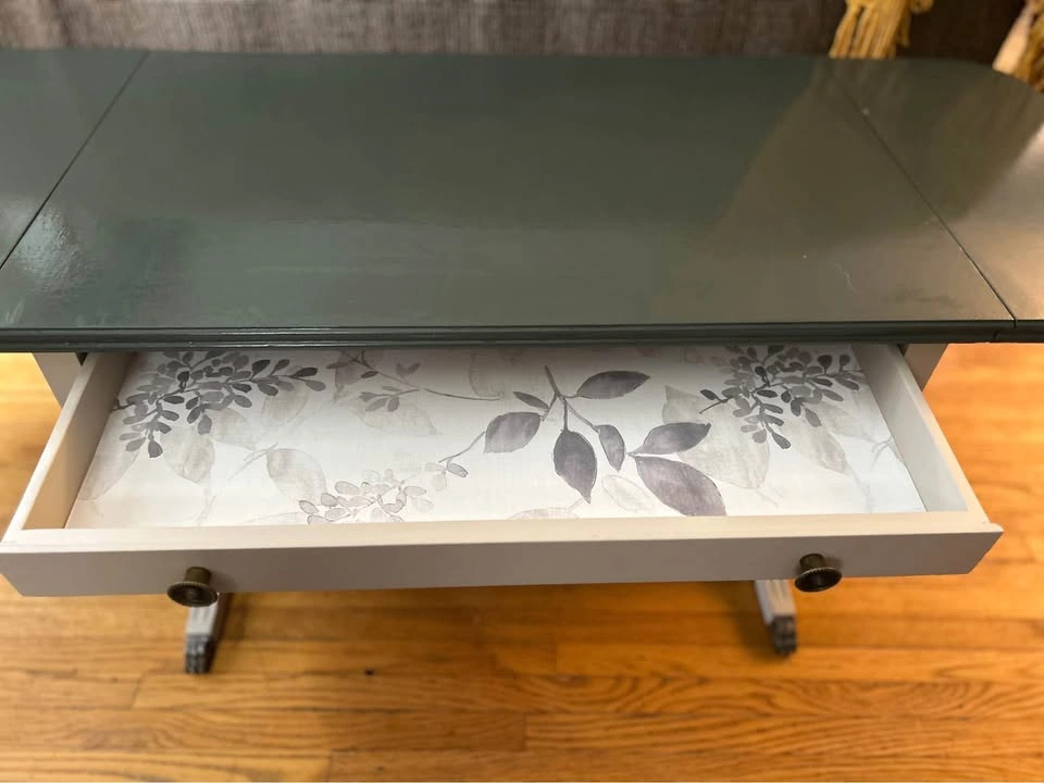 10Beautiful hand-painted drop-leaf table in great condition. Dark green top with cream base Functional drawer with floral paper lining Drop leaves fold down to save space or open for extra length Solid and sturdy with vintage-style details Dimensions: 45” length (open) 29” length (closed) 18” height 18” width Pick up only