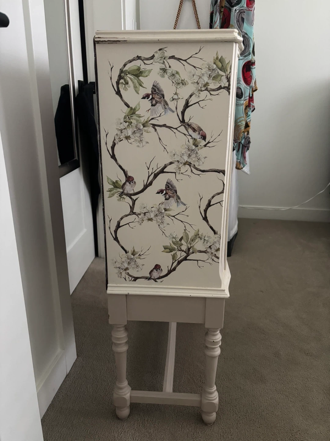 11Here's a charming vintage display cabinet, painted with a lovely floral and bird design. It's perfect for adding a touch of whimsy to any room! I am selling this item because moving out