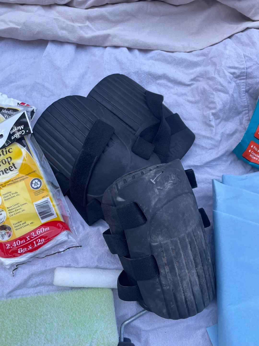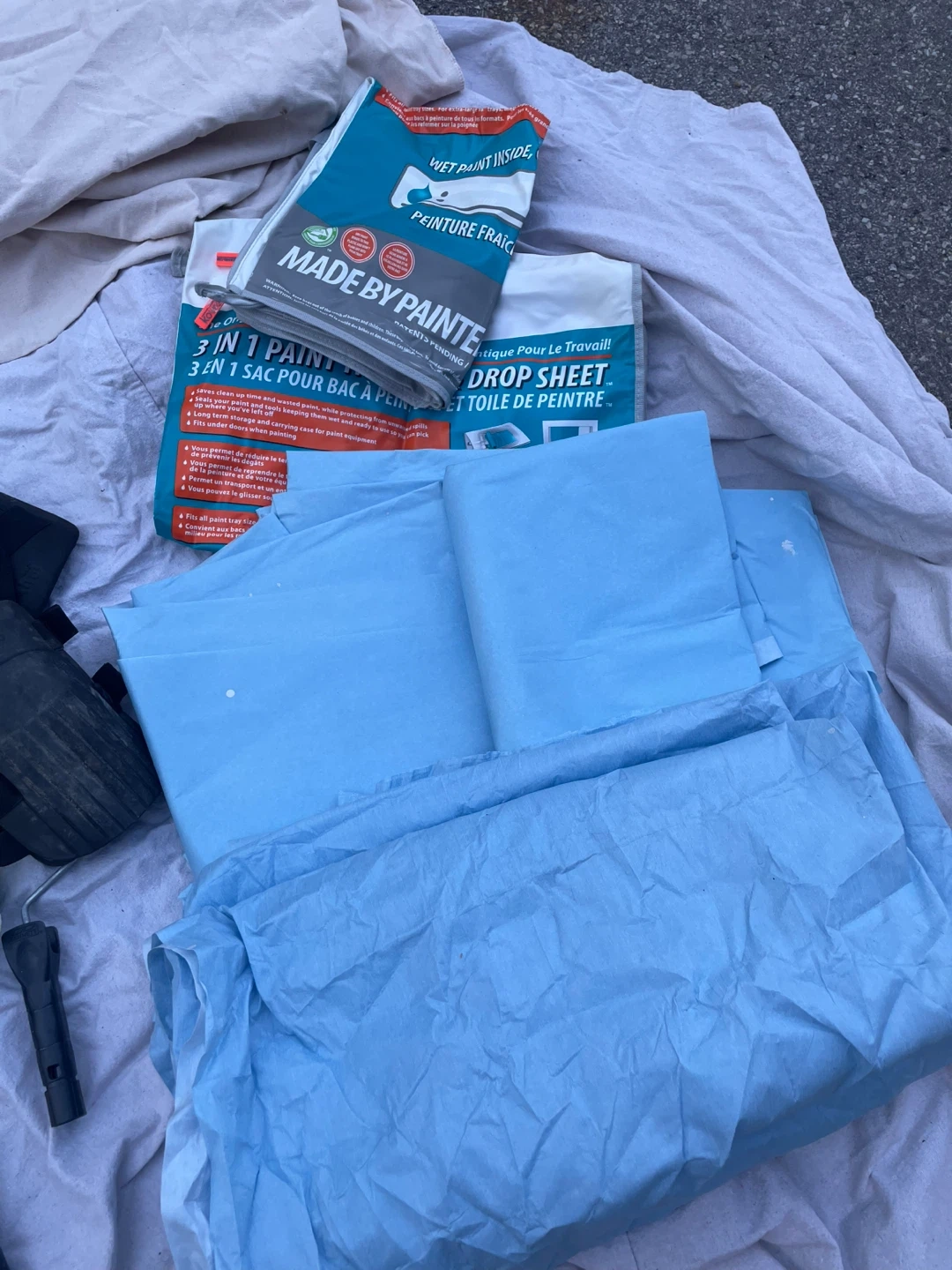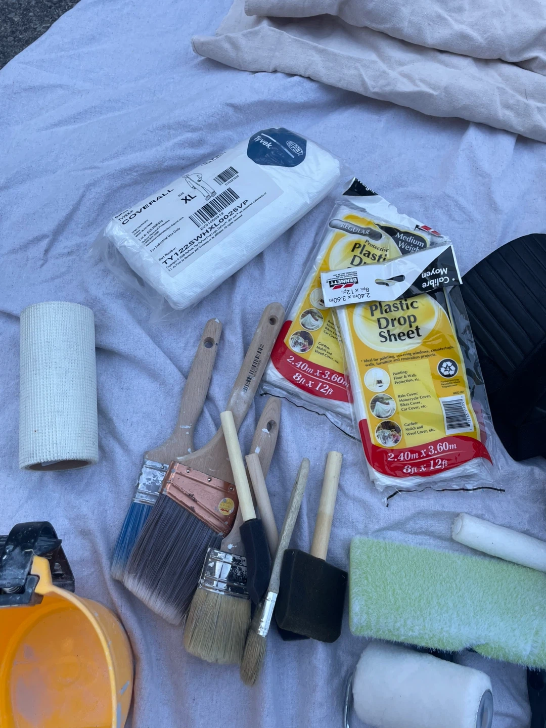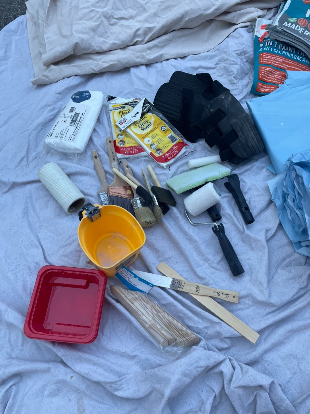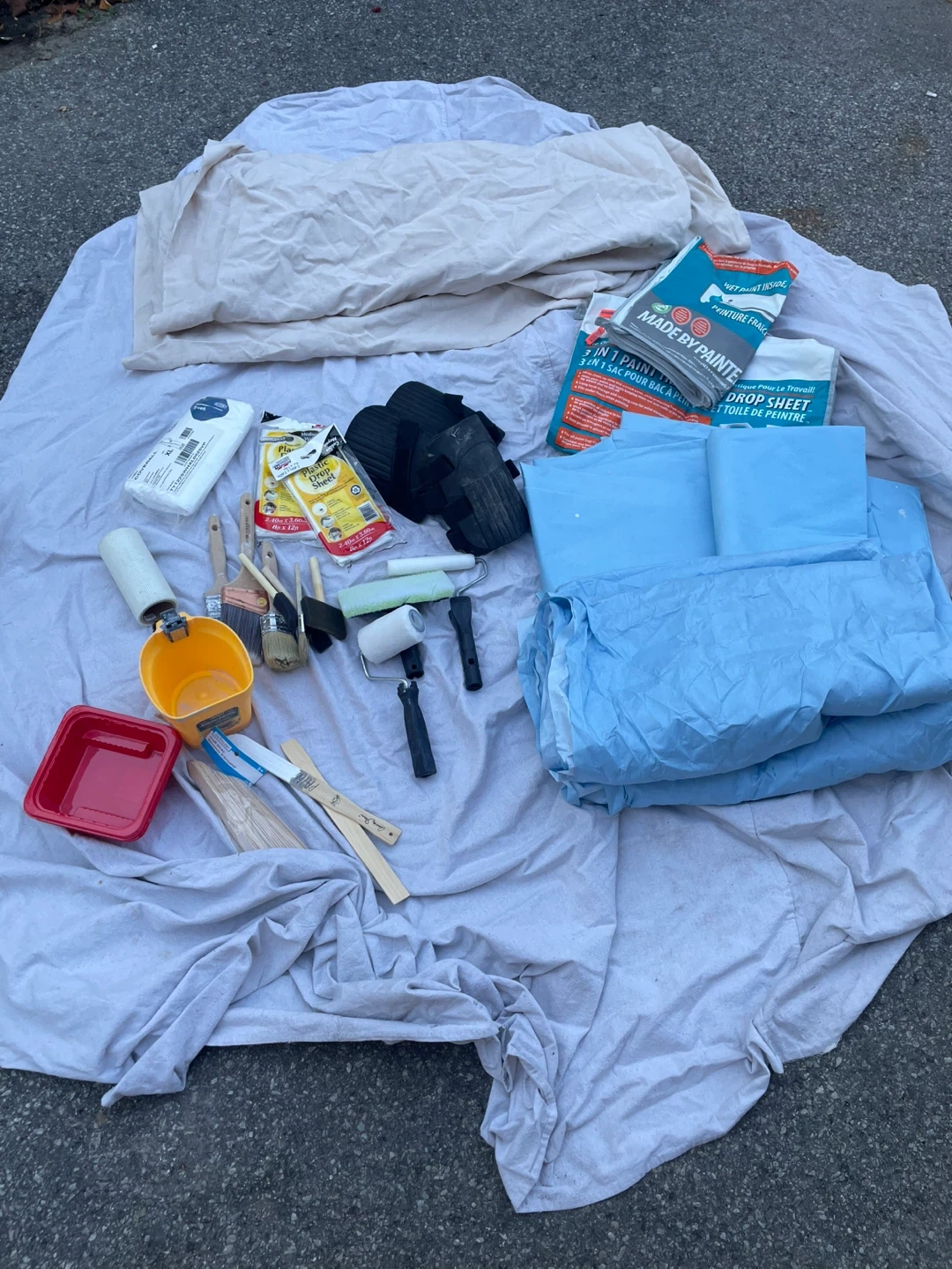 $25 for all - Brand new and used supplies. Selling a bundle of painting supplies! Includes brushes, rollers, a paint bucket, plastic drop sheets (2.40m x 3.60m), knee pads, and a Tyvek coverall in size XL. Everything you need to get your next painting project started.